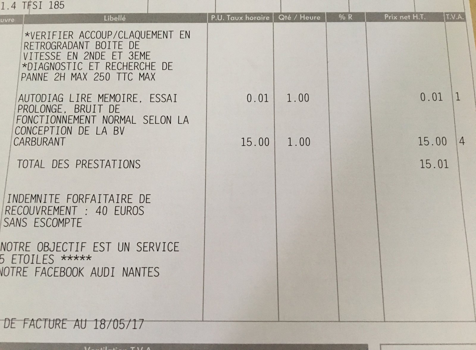 Bonjour peuple des 4 anneaux ! Paix à vous possesseurs d'A1 ! Mais pas paix à vous ceux qui ont des claquements de boite pour la Stronic 7 (la QS200, comme les intimes l'appelle). Dans ce post, je veux simplement expliquer, rassurer, apporter des précisions, ou bien faire douter certains, à vous de juger ! Je vais vous faire un rapport du diagnostique que j'ai été faire suite à des claquements de boite au rétrogradage ! Déjà je vais exposer mon soucis : Comme beaucoup de propriétaire d'A1 avant 2013, avec une boite S-Tronic 7, j'entends des claquements avec plus ou moins d'accoups lors de rétrogradage rapide ou forcé ! Dès que je freine pour un rond-point et que je dois reprendre de la vitesse si je ne m'arrête pas, la boite va rétrograder rapidement et va ensuite chercher le couple pour une reprise rapride de vitesse, c'est à ce moment que le claquement est le plus percevable ! (Ça fait un peu : "Chhhhh CLAQ CLAQ !"). Cela se fait ressentir seulement à faible régime, donc en ville c'est bien galère, et par moment je pensais que la boite allait lâcher ! Hormis cela le passage des vitesses est excellent sans claquement et accoups. Mais j'ai quand même décidé de l'emmener en diag chez audi. Au téléphone on m'a dit que le prix serait entre 65 et 250€ maxi. Je lui dis ok en me disant "Ils peuvent se lever tôt s'ils pensent que je vais le payer si y'a la boite à changer à cause d'un défault de conception !" Rdv pris, voiture déposée, j'ai attendu jusqu'au lendemain pour avoir des nouvelles. Je reçois donc un appelle d'audi : "Monsieur, aucune panne n'est à déplorer sur votre boite ! Nous avons interrogé l'ordinateur qui ne déplore aucune anomalie. Nous avons donc fais un essai prolongé de votre véhicule et nous avons constaté les mêmes claquements que vous nous avez décris ! Nous avons donc été à la pêche aux informations en interne au siege Volkswagen France, c'est effectivement un constatation qui a été faite pour cette boite de vitesse mais qui n'a pas de consequences sur la pérénité et la longévité de la boite, c'est seulement un problème de confort ! Veuillez passer a la concession que nous puissions faire un essai ensemble et vous montrer la lettre interne que nous avons reçu." Du coup j'y vais en me disant que je vais payer plein pot le diag puisqu'ils n'ont rien trouvé, et qu'ils y ont passé du temps. À mon arrivée, ils m'ont fait lire la lettre interne qui stipulait en résumé : Claquement et bruit de ferraille ressentis et audibles dû au fonctionnement normal de la BV, aucun changement de boite ou de mécatronic n'est à prescrir, car cela n'apportera aucune amélioration. Ces bruits n'influent pas négativement sur la durée de vie de la BV. Ils nuisent seulement au confort audible du conducteur. Voilà, du coup je me dis ok, on va faire l'essai avec le technicien qui s'est occupé du diagnostique. On a bien ressentis tous les deux les claquements, et il m'a expliqué le fonctionnement de la boite a double embrayage (que je connaissais déjà) ainsi que le fait que c'etait une boite sec, et qu'il n'y avait aucune boite qui ne produisait 0 décibels lors d'un rétrogradage ou un passage de vitesse. On s'est mis d'accord sur le fait que ce n'etait pas agréable et il m'a rassuré que ca n'avait pas de conséquences sur la boite, et que je pouvais reprendre confiance en ma voiture, parce que je n'osais plus trop la prendre ! Un changement de mécatronic ne serais pas nécessaire, et ne changerai rien ! En prime il m'a dit que j'avais une belle configue extérieure et intérieure. Je lui ai dis de pas jouer au sentimental avec moi ça marchait pas ! On a rigolé et je l'ai remercier (quand même). Du coup voilà, retour à la concession, et là surprise, je n'ai pas eu à payer le diagnostique. J'ai seulement eu à charge 15€ de carburant qu'ils ont mis car je leur ai donné la voiture sur la réserve ! Lol Ils ont été très gentils et ont compris mon mécontentement ! J'ai du coup eu un rapport de diagnostique qui stipule ce qu'ils m'ont dis, mais je n'ai pas eu le droit de garder la lettre interne (ce qui est normal) Le rapport : Voilà, ce rapport me permet d'avoir une preuve si un jour je veux vendre la voiture que tout vas bien sur la boite si l'acheteur est aussi tatillon sur ça ! Il me permet aussi de me retourner contre audi si ma boite lache demain. Bon logiquement ça ne devrait pas arriver du coup, selon leur dire ! Voilà, maintenant je n'ai plus qu'a faire abstraction de ces bruits en me disant que c'est normal, et que ma voiture est saine ! Merci de l'avoir lu et j'espère que cela pourra eclairer certains ou apporter quelques précisions ! Tchou1 point