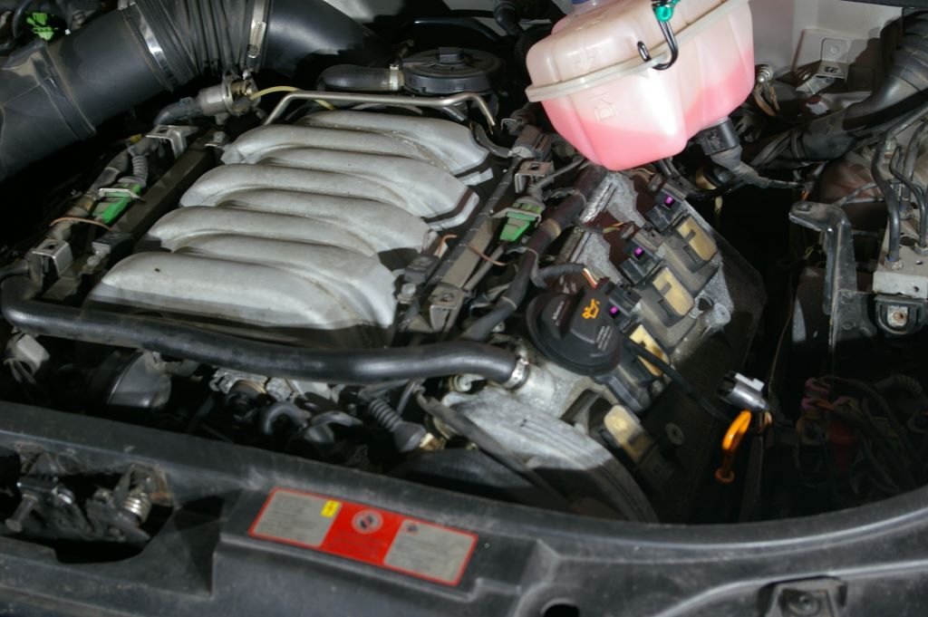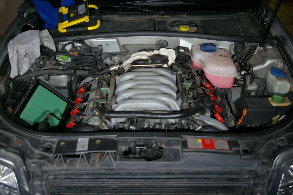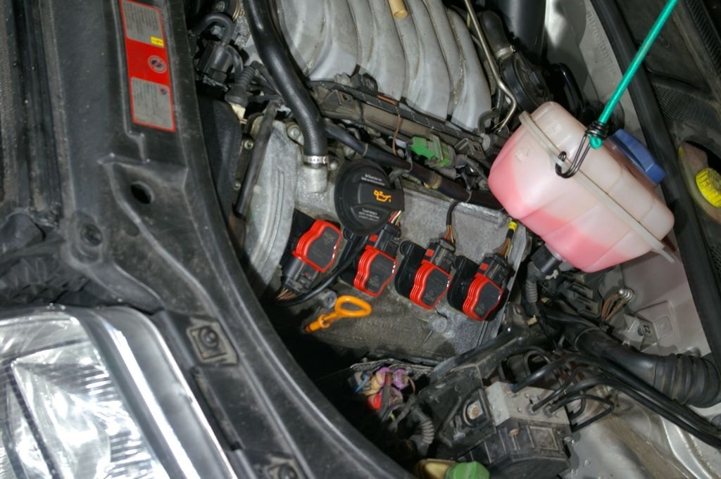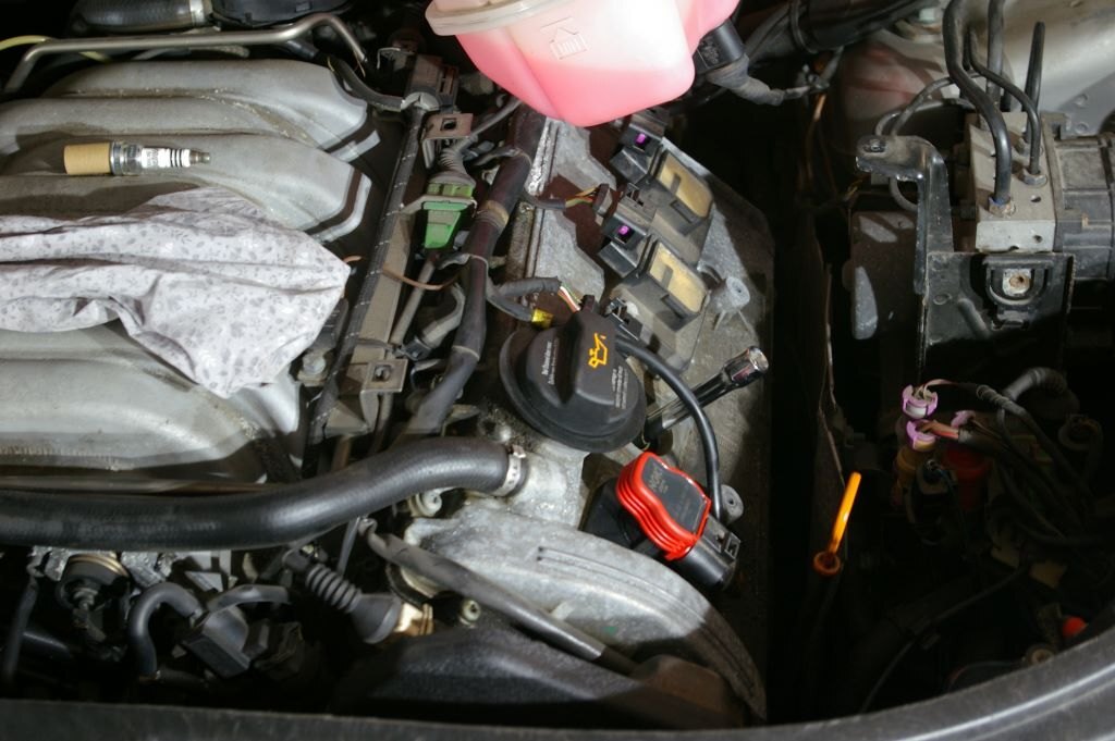 C'était mardi, et comme un Le Quesnoy de base, je me suis dit "c'est mardi, c'est l'Audi". J'ai donc préparé un établi de fortune (tréteaux, palette) juste à côté de la bestiole, posé quelques outils, et rassemblé toutes les pièces prévues pour ce jour là. Enfin presque toutes, un irréductible filtre à air vert ne s'est pas présenté sur la photo. J'ai en fait bêtement oublié de l'inclure dans le portrait, il s'est bien vengé ensuite... Après avoir enlevé les caches moteurs, attaquage du banc 2 (côté conducteur). 1) Défaire les trois vis torx qui maintiennent le bocal LdR, et le soutenir par un tendeur accroché à la serrure du capot. Pas visible sur les photos mais en cours de travail et pour faciliter l'accès au dernier cylindre, j'ai aussi débranché le capteur de niveau LdR et rajouté un deuxième sandow horizontal, de l'arrière du bocal à un truc près du tablier côté passager. 2) Enlever le support de cache vissé dans le bloc en dévissant les deux écrous de 10... Ah ben non, ya qu'un écrou de 10, l'autre a été remplacé par une cruciforme. Qui évidemment résistait et que j'ai failli bêtement foirer en essayant quand même, bien évidemment avec une empreinte Philips 2 quand c'était une 3 qu'il fallait... Heureusement, un petit coup de dégripant, 10 minutes de patience, quelques coups sur la tête (oui, de la vis aussi), assénés sinon avec douceur, du moins sans trop de brutalité, et hop, c'est sorti tout seul. (petit mémo, que j'ai respecté, en remontant ces vis acier dans le bloc alu, un peu de graisse cuivrée sur le filetage, serrage à la main sans forcer, et un petit coup de dynamométrique selon préconisations à 10 Nm) 3) Avant de procéder complètement, re-sortir une bobine, et vérifier que côté longueur ça va le faire. Et effectivement, en mettant l'entretoise au bon endroit sur la bobine, ça va déjà mieux. Il reste bien une différence apparente de l'ordre de 6 à 8 mm, mais c'est le métal en recouvrement qui se prolonge d'autant au delà de l'embout de la bobine, donc c'est bon. Bon allez, assez tergiversé, il est temps d'y aller. Opérations, pour chaque cylindre: 1) Débrancher la bobine. Simple. Une fois qu'on a compris comment la libérer, en insérant un fin tournevis plat jusqu'à soulever la fine lamelle de plastique et entendre le petit clic libérateur... 2) Enlever les deux écrous de 10 qui maintiennent la bobine. En finissant à la main pour bien le garder en main, parce que quand ça tombe, ça s'arrête dans le cache sous le moteur et pour le retrouver tu y passes bien 10 minutes à l'aveugle avec une tige a bout aimanté. La leçon étant bien comprise les poser dans le bac aimanté préparé justement pour ça sur l'établi. 3) Sortir la bobine. Rien de particulier à dire, elle vienne toute seule, pas besoin de l'outil particulier préconisé par Audi ou autre. 4) Avec une rallonge d'au moins 15 centimètre, une clé à bougie de 16, de préférence aimantée, dévisser un peu la bougie, passer un coup de soufflette dans le puits (précaution à mon avis inutile, vu l'étanchéité donnée par la plaque), démonter et sortir la bougie, nettoyer autant que faire se peut le plan de joint de la bougie (j'ai enfilé un chiffon sur le bout rond de ma rallonge et fait tourner, et ça avait l'air propre sur au moins le 1er mm de cercle...), mettre la bougie neuve à la main, sans graisse (préconisation NGK), serrer au couple, NGK indique 25-30 Nm j'en suis resté à 25. 5) Mettre en place l'entretoise en insérant les picots dans les trous et en procédant ensuite en force. Pas de blague, tige carré sur le morceau bien dans l'axe de la tige à insérer, et joyeusement au marteau. Ce qui ma conforté dans l'idée que j'avais bien fait de vérifier l'ajustement des bobines avec ces supports avant, je suis a peu près sûr que c'est pas simple à enlever 6) Enfoncer la bobine bien au fond, et rebrancher son connecteur. C'est l'occasion de découvrir que les connecteurs des nouvelles bobines sont un peu plus près du centre de la bougie, et donc un peu plus loin du milieu du moteur. Enfin, le découvrir, surtout en arrivant au cylindre 8, au fond, il manquait presque 1cm, il a fallu bouger franchement et décaler un peu le faisceau à cet endroit pour réussir le branchement. Photos des opérations en cours, et du banc 2 presque terminé: Après ça, repose du support de cache, remise du bocal LdR refixé avec ces trois Torx, et il va être temps de s'attaquer au banc 1. Que j'avais gardé en 2e rideau en sachant que yavait un ou deux trucs potentiellement plus compliqué. Déjà, pour accéder facilement à la dernière bobine, il vaut mieux prévoir d'enlever les conduits supérieurs d'admission. J'avais fait pour accéder à la sonde de température d'eau derrière le bloc, donc même pas peur. Et pour démonter les 2 et 3 facilement, ainsi que le support de cache, autant prévoir d'enlever la boîte à air. Ça tombe bien, j'ai justement un filtre Green prévu depuis longtemps, mais pas encore mis parce que j'avais cru deviner que la question de la boîte à air pouvait virer au vrai pensum. Vu que elle tient par 4 clips, 3 faciles à enlever, les deux à l'avant et celui à l'arrière côté carrosserie, mais quand au 4e, à l'arrière côté moteur, ben... Non seulement pas facile à voir tellement il est bien planqué, mais même avec un bon bout de l'admission enlevé, j'arrive pas à passer la main, il a fallu démonter aussi le morceau de tuyau rigide qui supporte le débitmètre en sortie de boîte à air. Et la j'arrive à passer une main et en me la martyrisant un peu, à déclipser ce fichu 4e clip. Youpi? Ben, la boîte se déboîte, le tuyau coudé à l'avant de la boîte se débranche en le faisant pivoter de quoi, 1/8e à 1/6e de tour, en poussant cette partie coudée vers le moteur (mis un peu de temps à trouver, c'est venu presque par hasard...) et déclipser la petite durite qui cour