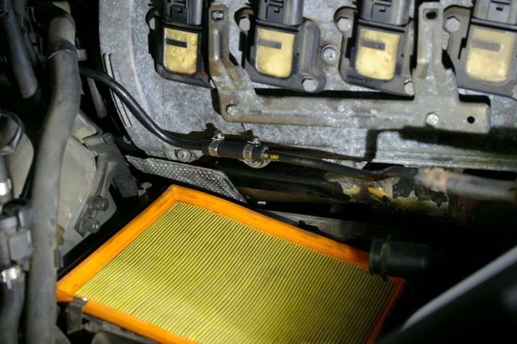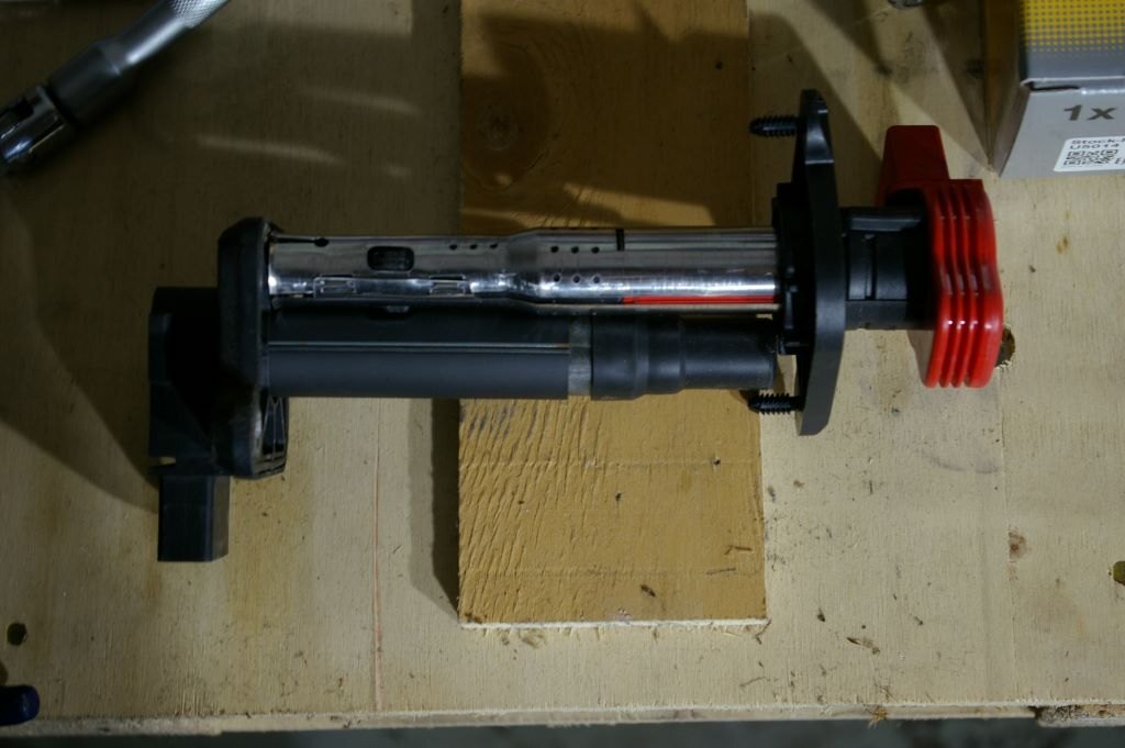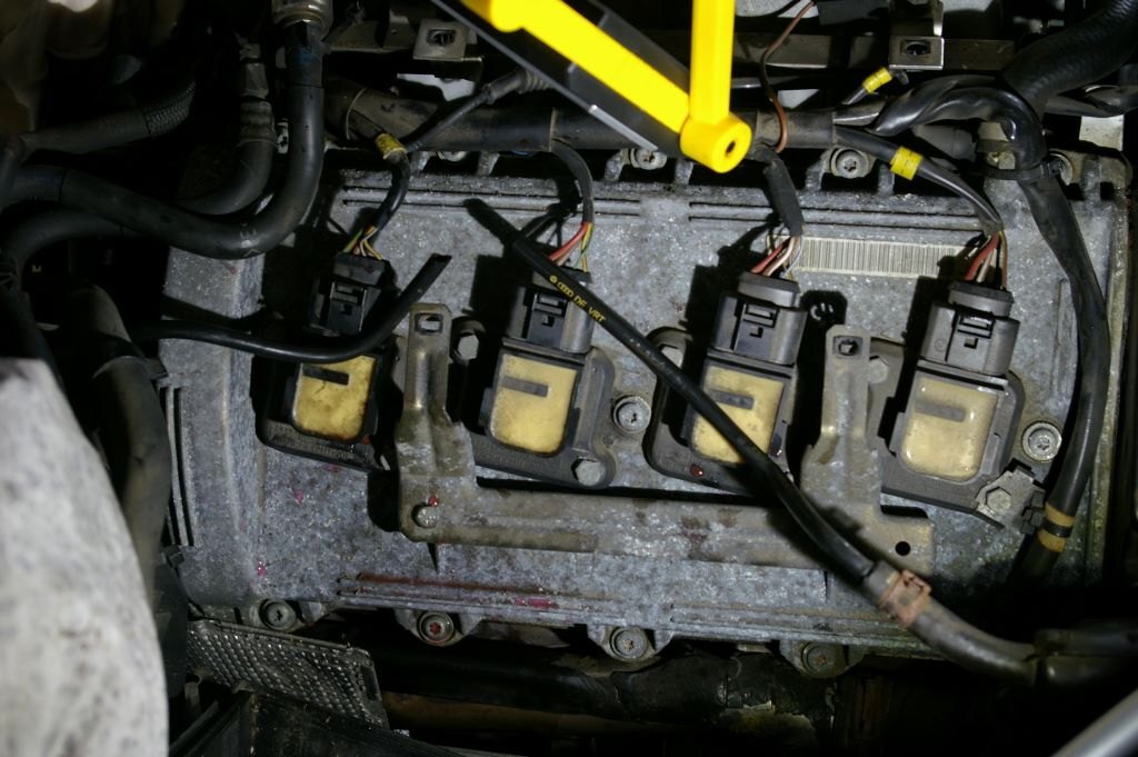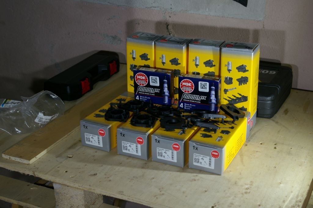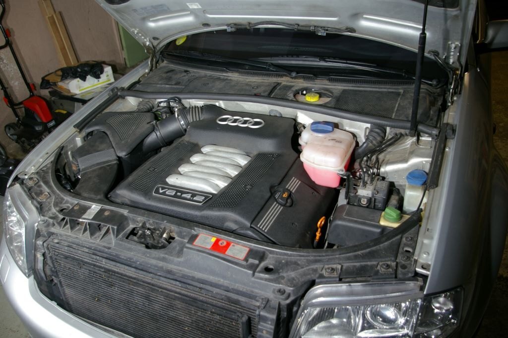 C'était mardi, et comme un Le Quesnoy de base, je me suis dit "c'est mardi, c'est l'Audi". J'ai donc préparé un établi de fortune (tréteaux, palette) juste à côté de la bestiole, posé quelques outils, et rassemblé toutes les pièces prévues pour ce jour là. Enfin presque toutes, un irréductible filtre à air vert ne s'est pas présenté sur la photo. J'ai en fait bêtement oublié de l'inclure dans le portrait, il s'est bien vengé ensuite... Après avoir enlevé les caches moteurs, attaquage du banc 2 (côté conducteur). 1) Défaire les trois vis torx qui maintiennent le bocal LdR, et le soutenir par un tendeur accroché à la serrure du capot. Pas visible sur les photos mais en cours de travail et pour faciliter l'accès au dernier cylindre, j'ai aussi débranché le capteur de niveau LdR et rajouté un deuxième sandow horizontal, de l'arrière du bocal à un truc près du tablier côté passager. 2) Enlever le support de cache vissé dans le bloc en dévissant les deux écrous de 10... Ah ben non, ya qu'un écrou de 10, l'autre a été remplacé par une cruciforme. Qui évidemment résistait et que j'ai failli bêtement foirer en essayant quand même, bien évidemment avec une empreinte Philips 2 quand c'était une 3 qu'il fallait... Heureusement, un petit coup de dégripant, 10 minutes de patience, quelques coups sur la tête (oui, de la vis aussi), assénés sinon avec douceur, du moins sans trop de brutalité, et hop, c'est sorti tout seul. (petit mémo, que j'ai respecté, en remontant ces vis acier dans le bloc alu, un peu de graisse cuivrée sur le filetage, serrage à la main sans forcer, et un petit coup de dynamométrique selon préconisations à 10 Nm) 3) Avant de procéder complètement, re-sortir une bobine, et vérifier que côté longueur ça va le faire. Et effectivement, en mettant l'entretoise au bon endroit sur la bobine, ça va déjà mieux. Il reste bien une différence apparente de l'ordre de 6 à 8 mm, mais c'est le métal en recouvrement qui se prolonge d'autant au delà de l'embout de la bobine, donc c'est bon. Bon allez, assez tergiversé, il est temps d'y aller. Opérations, pour chaque cylindre: 1) Débrancher la bobine. Simple. Une fois qu'on a compris comment la libérer, en insérant un fin tournevis plat jusqu'à soulever la fine lamelle de plastique et entendre le petit clic libérateur... 2) Enlever les deux écrous de 10 qui maintiennent la bobine. En finissant à la main pour bien le garder en main, parce que quand ça tombe, ça s'arrête dans le cache sous le moteur et pour le retrouver tu y passes bien 10 minutes à l'aveugle avec une tige a bout aimanté. La leçon étant bien comprise les poser dans le bac aimanté préparé justement pour ça sur l'établi. 3) Sortir la bobine. Rien de particulier à dire, elle vienne toute seule, pas besoin de l'outil particulier préconisé par Audi ou autre. 4) Avec une rallonge d'au moins 15 centimètre, une clé à bougie de 16, de préférence aimantée, dévisser un peu la bougie, passer un coup de soufflette dans le puits (précaution à mon avis inutile, vu l'étanchéité donnée par la plaque), démonter et sortir la bougie, nettoyer autant que faire se peut le plan de joint de la bougie (j'ai enfilé un chiffon sur le bout rond de ma rallonge et fait tourner, et ça avait l'air propre sur au moins le 1er mm de cercle...), mettre la bougie neuve à la main, sans graisse (préconisation NGK), serrer au couple, NGK indique 25-30 Nm j'en suis resté à 25. 5) Mettre en place l'entretoise en insérant les picots dans les trous et en procédant ensuite en force. Pas de blague, tige carré sur le morceau bien dans l'axe de la tige à insérer, et joyeusement au marteau. Ce qui ma conforté dans l'idée que j'avais bien fait de vérifier l'ajustement des bobines avec ces supports avant, je suis a peu près sûr que c'est pas simple à enlever 6) Enfoncer la bobine bien au fond, et rebrancher son connecteur. C'est l'occasion de découvrir que les connecteurs des nouvelles bobines sont un peu plus près du centre de la bougie, et donc un peu plus loin du milieu du moteur. Enfin, le découvrir, surtout en arrivant au cylindre 8, au fond, il manquait presque 1cm, il a fallu bouger franchement et décaler un peu le faisceau à cet endroit pour réussir le branchement. Photos des opérations en cours, et du banc 2 presque terminé: Après ça, repose du support de cache, remise du bocal LdR refixé avec ces trois Torx, et il va être temps de s'attaquer au banc 1. Que j'avais gardé en 2e rideau en sachant que yavait un ou deux trucs potentiellement plus compliqué. Déjà, pour accéder facilement à la dernière bobine, il vaut mieux prévoir d'enlever les conduits supérieurs d'admission. J'avais fait pour accéder à la sonde de température d'eau derrière le bloc, donc même pas peur. Et pour démonter les 2 et 3 facilement, ainsi que le support de cache, autant prévoir d'enlever la boîte à air. Ça tombe bien, j'ai justement un filtre Green prévu depuis longtemps, mais pas encore mis parce que j'avais cru deviner que la question de la boîte à air pouvait virer au vrai pensum. Vu que elle tient par 4 clips, 3 faciles à enlever, les deux à l'avant et celui à l'arrière côté carrosserie, mais quand au 4e, à l'arrière côté moteur, ben... Non seulement pas facile à voir tellement il est bien planqué, mais même avec un bon bout de l'admission enlevé, j'arrive pas à passer la main, il a fallu démonter aussi le morceau de tuyau rigide qui supporte le débitmètre en sortie de boîte à air. Et la j'arrive à passer une main et en me la martyrisant un peu, à déclipser ce fichu 4e clip. Youpi? Ben, la boîte se déboîte, le tuyau coudé à l'avant de la boîte se débranche en le faisant pivoter de quoi, 1/8e à 1/6e de tour, en poussant cette partie coudée vers le moteur (mis un peu de temps à trouver, c'est venu presque par hasard...) et déclipser la petite durite qui cour