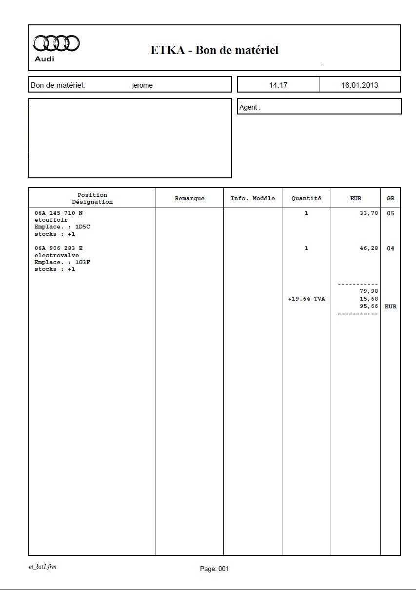 Je suis passé chez AMAG (Audi Genève) ce midi, le technicien a levé la voiture, ôter le cache "TURBO 5V" pour constater que c'est le raccord en Bakélite (plastique dur noir) sur lequel est monté un thermostat (4 pôles vert), le tout fixé sur la droite du bloc (lorsqu'on le regarde face) qui n'est plus étanche avec le bloc. Le petit soucis c'est qu'il y a 2 types de raccord possible donc il faut démonter pour voir de quel modèle il s'agit, commander la bonne pièce, laisser la voiture en plan en attendant de la recevoir, monter, purger le LDR... Résultat : Raccord: 21.- CHF (env. 17€) Thermostat: 40.- CHF (env. 33€) Mais surtout 2h de MO... C'est la que ça pique!! Voilà l'info pour qui cela peut aider.... Cela ne serait-il pas l'occasion de changer le joint de cache culbuteur qui est bien gras ? Ça représente beaucoup de boulot? -