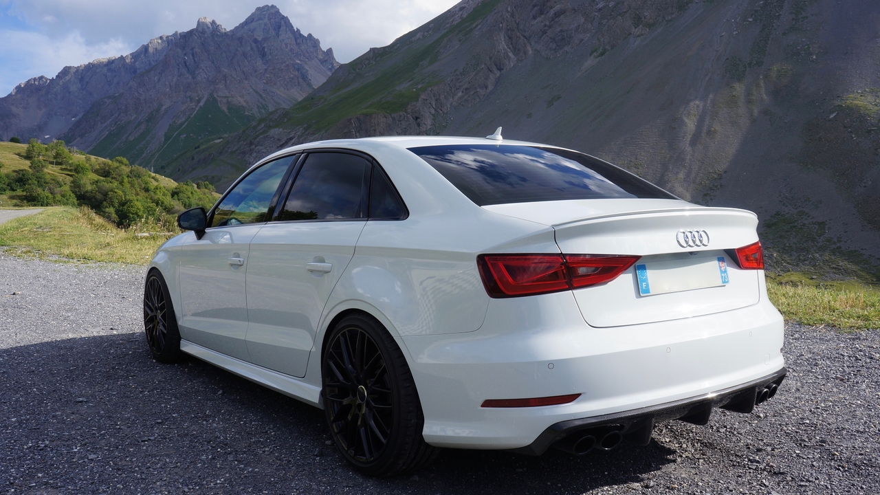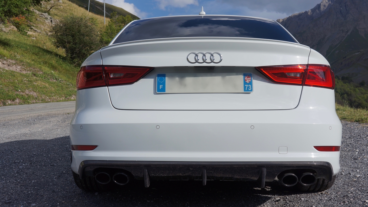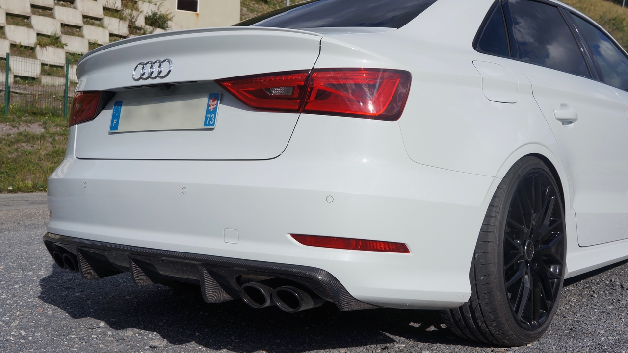 Salut, après beaucoup d'absence sur le forum faute de temps, je repasse donner quelques news de la S3 !!! 65 000 Km au compteurs et toujours autant de plaisirs à son volant. Gardant d'habitude mes voitures 2 ans, cela va faire bientôt 3 ans que je l'ai, et en ce moment aucune autre ne me fait envie de changer. Il y a eu quelques modifs esthétiques, si ça peut donner des idées... - Calandre RS3 (originale Audi) - Peinture des sorties d'échappements - Coques de rétro carbone - Diffuseur carbone - jantes audi originale (8,5 x 19 et 43) finition carbone en hydro dipping J'ai garder les élargisseurs et ça ne touche jamais, par contre je ne sais pas si ça passera au contrôle technique... On verra bien... Voilà à+ -