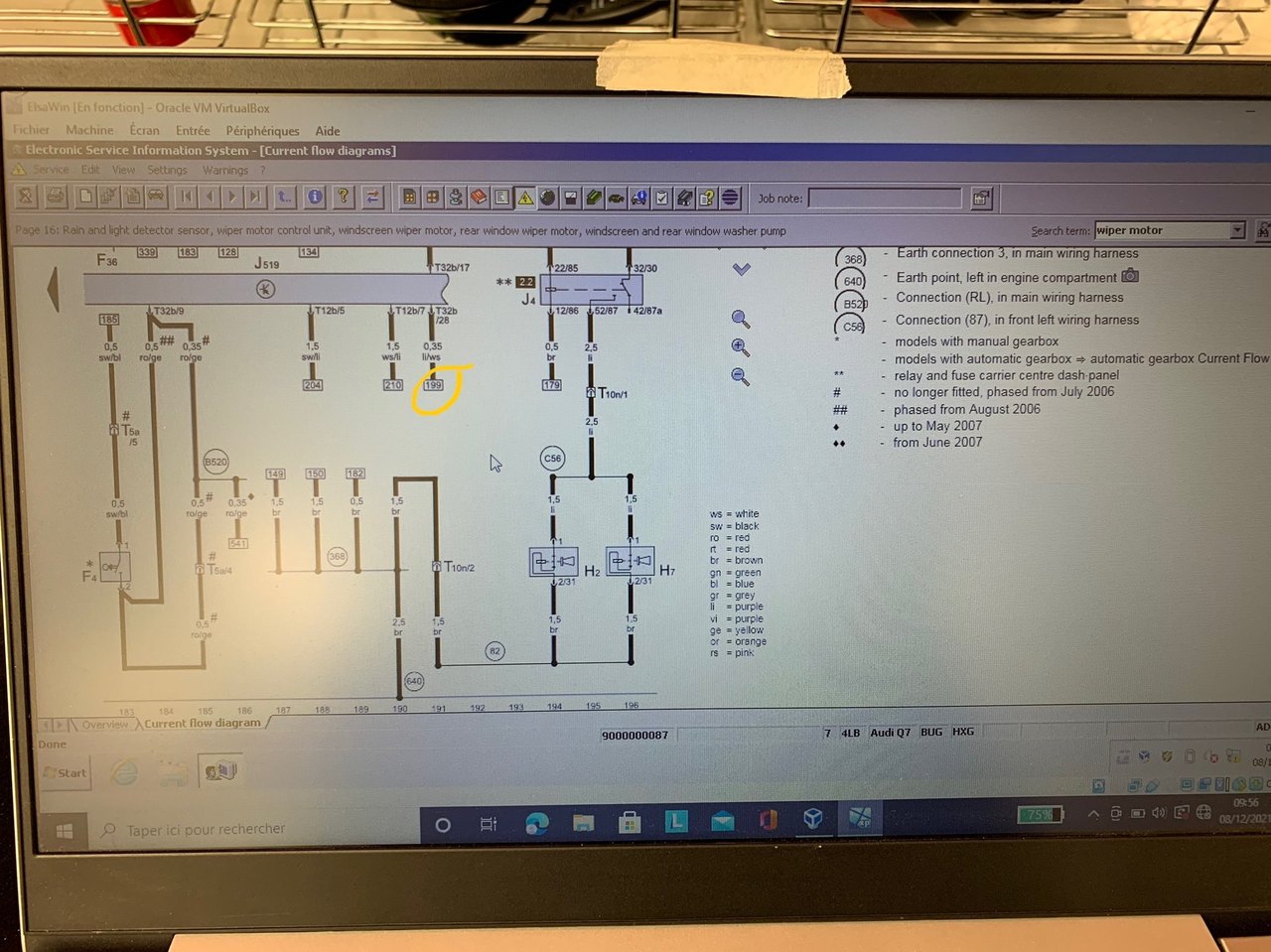 Bon j’ai fait au feeling En rouge : ton fusible En vert : ton moteur essuie glace En jaune : le calculateur de bord Tu as trois files sur ton moteur. 1 rouge bleu (+ venant du fusible) 1 marron (masse) 1 violet blanc (commande venant du calculateur J519) -