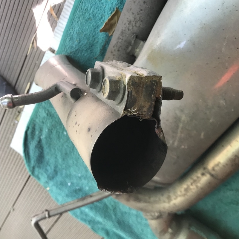 Alors marche arrière pour faire demi-tour les roues arrières dans la parcelles et… et le pot accroche. Mais comme il accroche partout j'me dis allez force ! Et crack le pot plié arraché, les attaches fendues, la valence cassée et le parechoc tordu… -