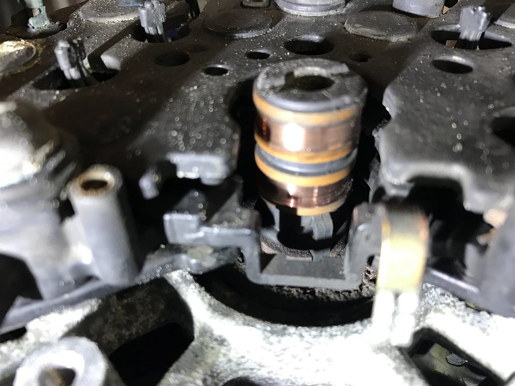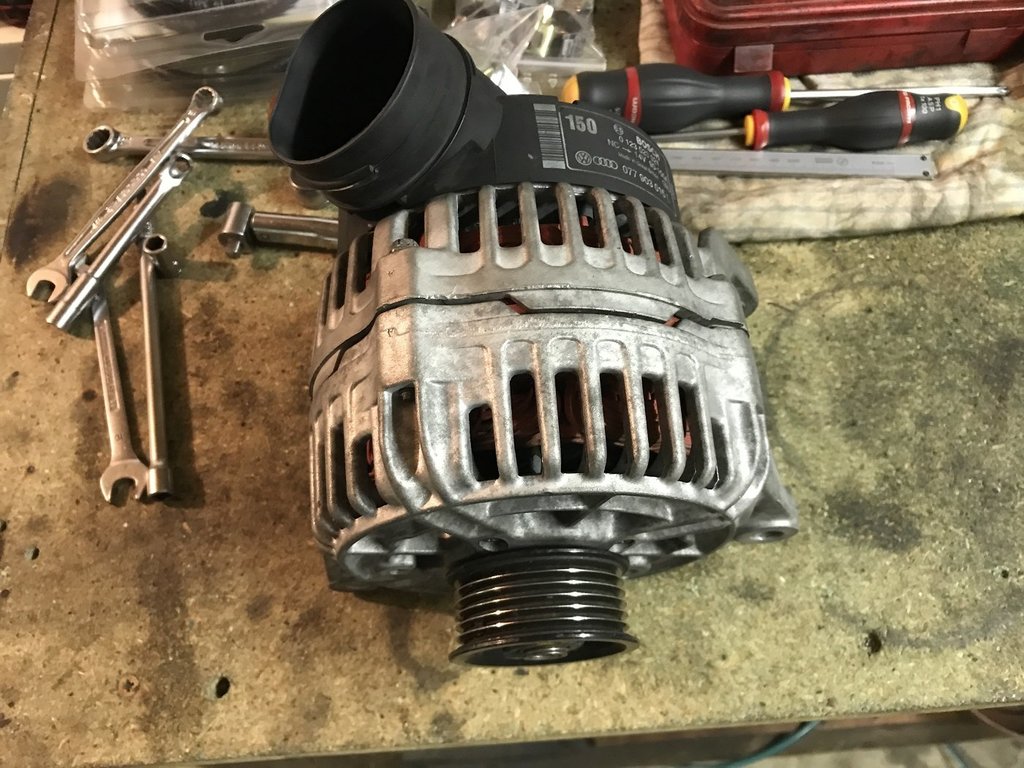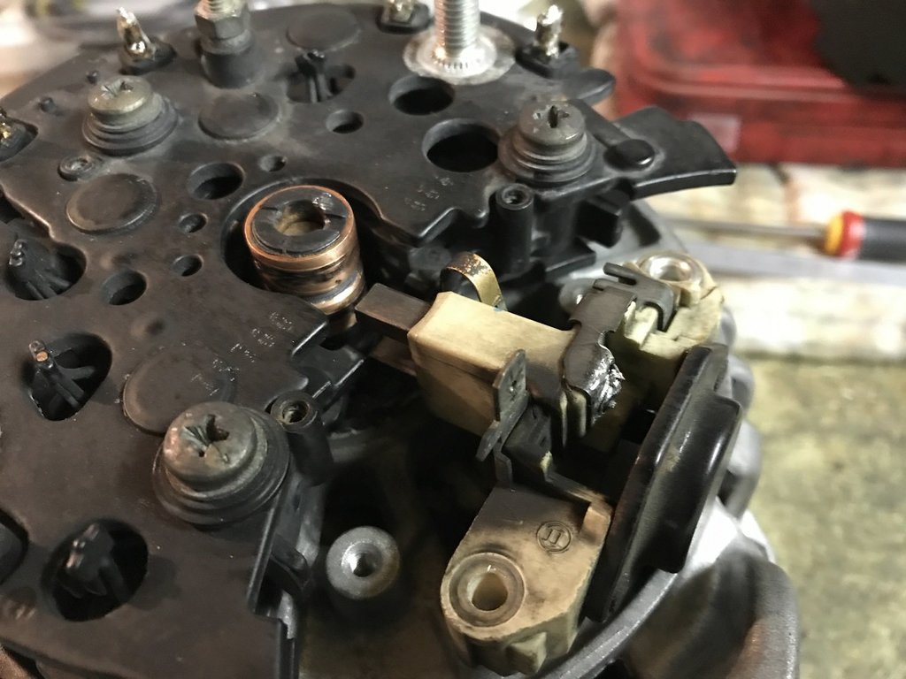 en attendant mes pièces pour remonter la distribution ,j'en profite pour refaire mon alternateur qui a 230 000 kms , une boite prêt de chez moi les révises complètement pour un prix correcte 120€ roulement ,charbons ,bague collectrice neuf voici avant avec charbons et bague usé et maintenant , même les écrous sont neuf -