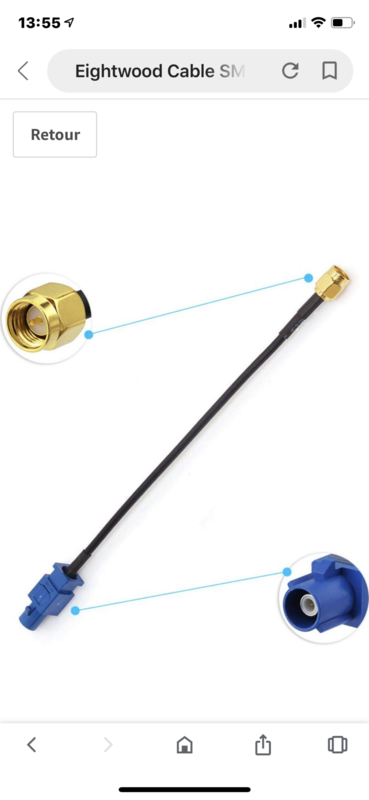 salut franck , alors pas encore , mais je fais des tests et voici pour commencer un test avec l’antenne sur le toit aimantée , alors dejas comme ça , sa me plait bien on voit bien la différence avec et sans l’antenne alimentée voici une video en sortant du boulot et je roule pas vite , un temps bien pourri ,tres couvert c'est une capture vidéo de l'iphone X avec une apli test GPS pour la suite vu que j'ai toujours une antenne GPS d'origine sur le toit , je vais essayer de m'en servir , j'ai un connecteur pour brancher le récepteur allume cigare a l'antenne et si sa marche sa m’éviteras d'avoir l'antenne magnétique avec le câble qui passe par la portière qui me plait pas. voici le cable pour brancher l'antenne d'origine avec un peu de change que sa marche voici le connecteur -