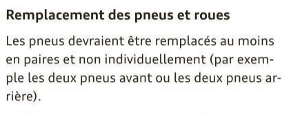 La situation particulière de Theo exige peut-être le remplacement des 4 pneus mais l'obligation de changer le train entier (x4) imposée par le système Quattro est une vieille antienne qu'on entend régulièrement de la part des vendeurs de pneus et des garagistes. J'ai subi ce discours il y a quelques mois de la part d'un professionnel lorsque j'ai accroché le flanc d'un de mes pneus à l'avant. Il fallait absolument changer les 4 pneus qui avaient tout juste 10000km. J'ai pris le parti de ne changer que le train AV sans ressentir la moindre différence de comportement jusqu'à présent. Le différentiel d'usure AV/AR peut se corriger naturellement au gré des permutations après chaque hiver pour autant qu'il n'y ait pas trop d'écart à la base. Le manuel utilisateur n'émet d'ailleurs aucune recommandation en la matière. Voir extrait ci-dessous au chapitre Pneus et Roues. -