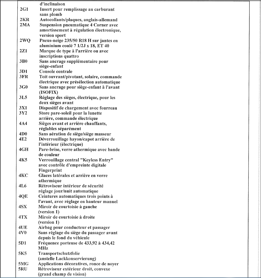 Bonsoir a tous je suis sur ce forum depuis un moment je possedais une A6 avec laquelle j'ai jamais pu rouler pour la cause qui n'etais pas la pompe à injection mais le moteur qui était hs :mur: . J'ai donc acquis une A8 D3 4,2 V8 de 2003 , avec seulement 164260 kms mais un entretien qui laisse a désirer :meanie: :meanie: je l'ai récupéré en faisant un échange sur ma 607 v6 204chx..... aujourd'hui j'en ai fais le tour et pas mal de petites choses a changer surtout dans l'habitacle , Quelques exemples : vide poche porte conducteur cassé qui tient avec une vis pour qu'elle reste fermée, reglage colonne de direction electrique qui ne fonctionne pas , porte arriere cote passager qui n'actionne plus le verrouillage , et la vitre ne descend et ne monte plus, trappe a essence qui ne se vérouille plus (cassé) et mecanisme démonté mais moteur fonctionnel, gâche de verrouillage du coffre ,câble a changer , batterie hs, tiroir monnaie hs , anti brouillard qui ne fonctionne pas , le mec avais installé des feux de jours made in kéké , un seul phare avec ampoule de bifurcation :reflexion: (photos a venir) et réglage du site des phares defectueux ... Sinon dans l'ensemble tout le reste à l'air de fonctionner mais je compte pas la laisser comme ca , je met ci joint le listing options