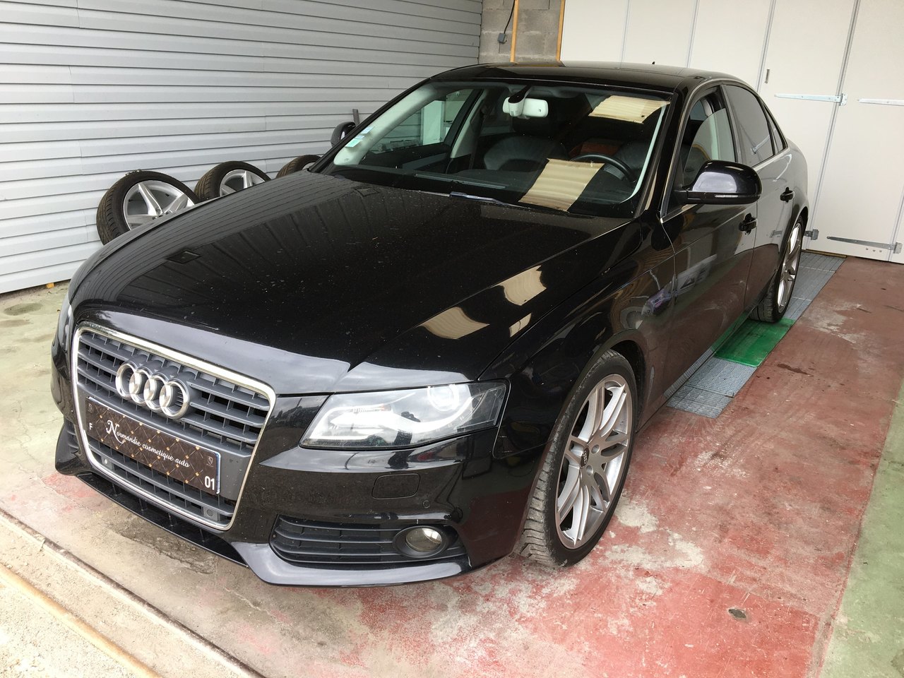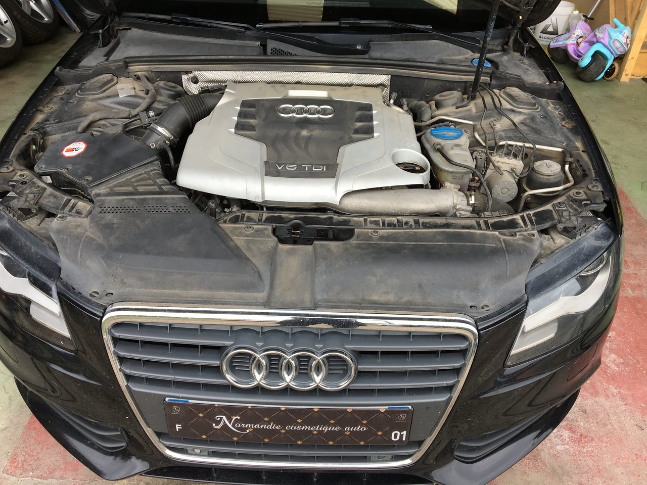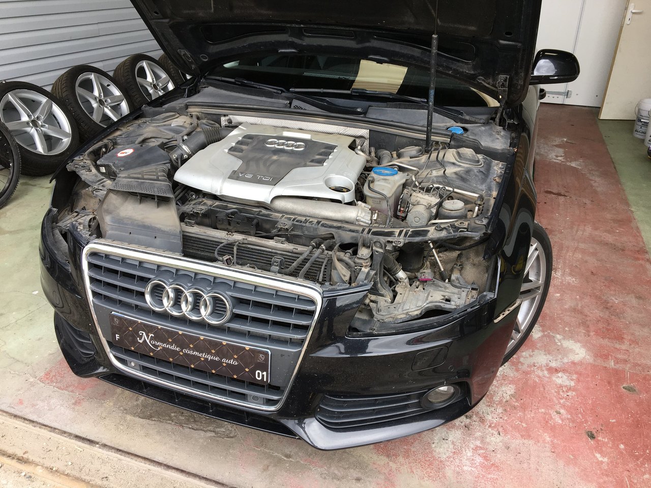 Bonjour a tous. Après une absence sur le forum depuis déjà quelque temps et la vente de mon a4 b7 à regret me revoilà avec un nouveau projet. Une nouvelle recette normande avec une nouvelle base, une a4 b8 2,7 v6 tdi 190 ch. Même si la base change je garde les mêmes ingrédients que mon ancienne. Le mariage du noir et du gris avec un saupoudrage de look rs et le tout assaisonné d’une belle rénovation esthétique (elle en a bien besoin !). Au programme. Peinture des éléments suivants car malheureusement trop de défauts pour être corrigé avec un polissage- peinture pare choc avant - peinture pare choc arrière- peinture aile avant droite et gauche-peinture portière arrière droite et gauche. Passage de certains éléments en gris. Peinture des étriers en rouge, teintage des feux arrière. Ensuite une grosse rénovation complète extérieure avec la pose d’un traitement céramique et l’intérieur auras le droit à une rénovation des cuirs avec une reteinte de certains éléments. Pour l’habillage depuis peu elle a reçu de nouvelles roulettes types rs4 en 19 pouces en remplacement des 18 d’origine, mais je l’espère un peu plus tard poser des 20 pouces. Pour l’arrière pose d’un nouveau diffuseur avec des sorties d’échappements et pose d’un béquet. Pour la face avant pose d’une nouvelle calandre type rs avec ces grilles d’antibrouillard. Un joli petit programme que je souhaitais faire depuis 2 ans mais par manque de temps car création d’entreprise (Centre de detailing) elle était malheureusement restée dans son état initial. Je vous rassure j’avais honte de rouler avec une voiture dans cet état et de plus pour un detailer c’est honteux. Il est temps qu’elle retrouve son éclat des premiers jours et un look plus agressif. Voici les photos de son état initial par la même occasion de mon centre. Je vous posterai des photos régulièrement de l’avancée de mon projet. Au plaisir de pouvoir a nouveau échangé avec vous.
