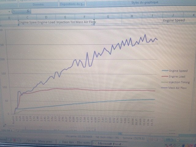 Alors les news! Nous avons fait quelques log, Apparament pas de problème d'allumage, mais le débitmètre présente des signes de fatigue,je vais essayer de vous mettre la courbe 😉
