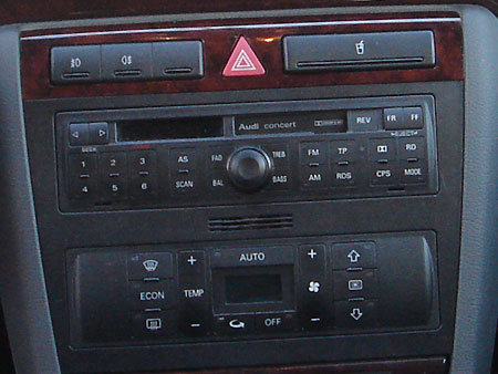 Bonjour, je n'ai pas encore mon A4, elle sera devant chez moi mardi et je me pose déjà plein de questions. J'ai un Concert (je sais pas si c'est le 1 ou 2) à K7. Je souhaite rajouter un chargeur CD. Je voudrais savoir si cet autoradio peut le piloter sans PB et si le pré-équipage dans le petit coffre de gauche à l'arrière est systématique (c'est une A4 Avant de 2000). De plus, si quelqu'un avait une photo du même modèle en fonction, histoire de voir ce que ça donne, ce serait cool.