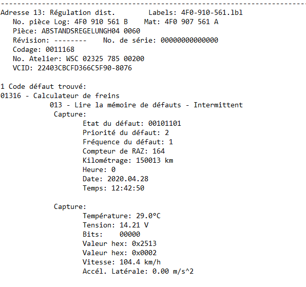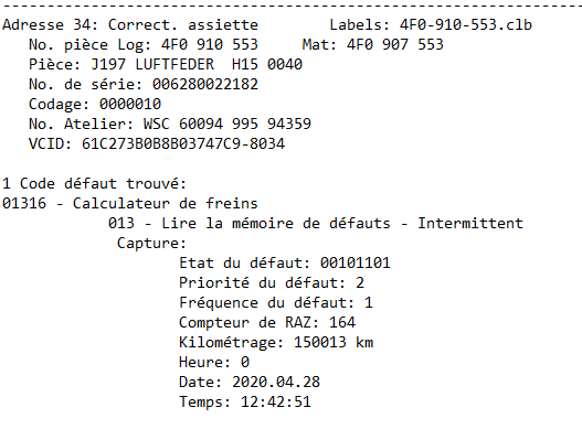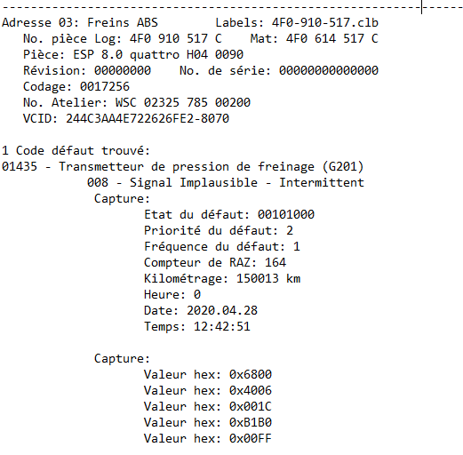 Aujourd'hui sortie avec la voiture.... et ...à un moment, tous les voyants liés au freinage se sont allumés, avec inscription sur l'ODB "perturbation ESP / ABS". Voyants qui s'éteignent à l'arrêt au feu rouge, mais revient direct dès que je roule. J'ai passé la Vag-Com, et le résultat est le suivant : à priori, tout serait lié au Transmetteur G201 Vous connaissez ? -