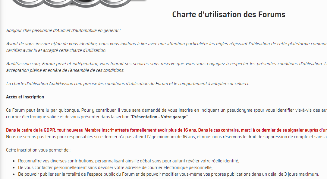 Il est important de ne pas oublier, qu'en naviguant sur cette plateforme et qu'en vous connectant sur AudiPassion, que vous avez lu et accepté notre charte d'utilisation.