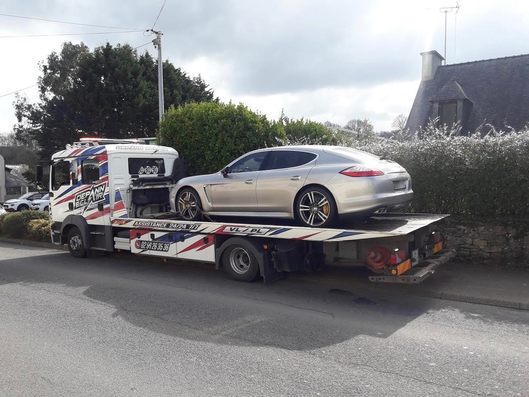 Bonjour à tous , les nouvelles ne sont pas bonnes après le remplacement de mes 8 bobines et bougies et la valve PCV je véhicule fume toujours autant des 2 échappements . Le diagnostic me mets 2 codes de défauts P0305 et P1025 . Bon ! malgré mes efforts vendredi , j'ai du la laisser partir vers le centre Porsche Au bout de 30s après avoir démarré on a tout stoppé , je pense sincèrement on a perdu 3L d' essence d'un coup par les échappements avant de la sortir du garage . Le dépanneur à même eu peur que la voiture s'enflamme . On a du bloquer la route avec l'intervention de la gendarmerie pour réguler le trafic et pousser la voiture à la main (mode N )jusqu'a la présenter correctement devant le plateau de remorquage . Ensuite frein à main et boite en mode P J'espère que l'aventure continuera mais j'ai pas connu d'expérience similaire sur mes véhicules . Ici la voiture avec les fumées et simultanément de l'essence qui sort via les pots d'échappements . Et le remorquage vers le centre Porsche Vendredi .