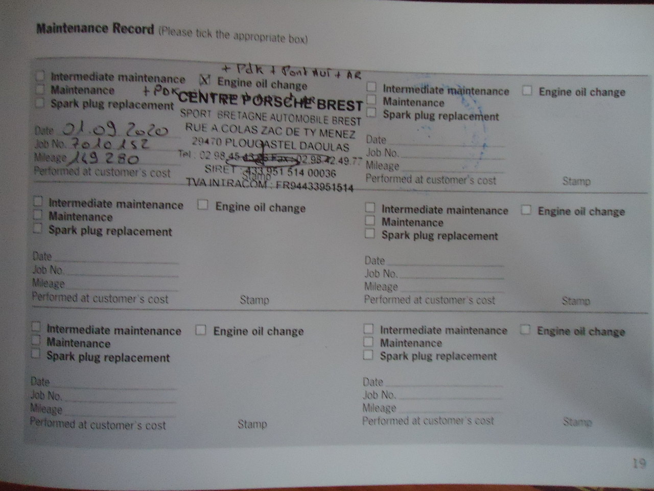 Je me suis amusé à reprendre toutes les données du carnet d'entretien pour une lecture plus visible . Pour les intervalles de vidanges Porsche c'est tous les 2ans ou 30000km . Dates Kilométrage intervalle km intervalle jours 19/07/2010 15km 0 0 21/12/2010 17255 km 17255 km 155j 19/09/2011 30237 km 12982 km 273j 03/09/2012 41192km 10955 km 349j 04/09/2013 54868 km 13676 km 366j 15/12/2014 70100 km 15232 km 426j 3/07/2015 80815 km 10715 km 201j 16/12/2015 90652 km 9837 km 166j 23/07/2016 99019 km 8367 km 220j 11/04/2017 110549 km 11530 km 263j 5/01/2018 124961 km 14412 km 269j 10/10/2018 139669 km 14708 km 279j 21/05/2020 147836 km 8167 km 590j Vidange boite de vitesse PDK tous les 6ans maximun ou 90000km 16/12/2015 90652 km 1/09/2020 Programmé