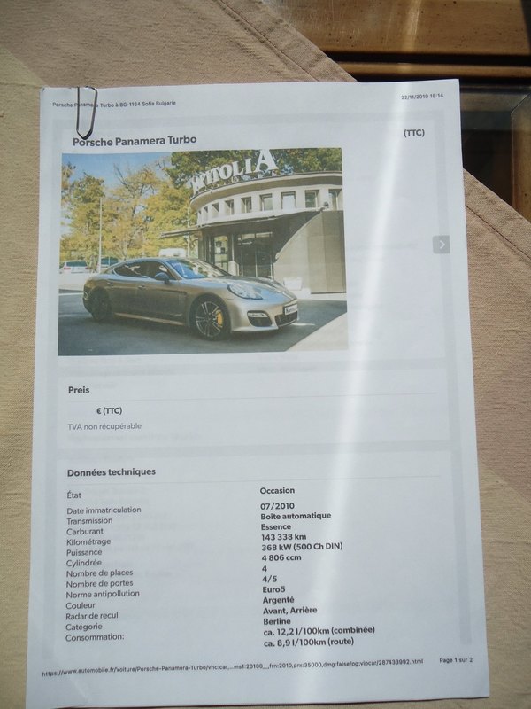 Petit retour de chez Porsche Brest très satisfait de leurs accueil chaleureux , très content d'avoir quelque peu discuté sur la Panamera et la 911. Il ont trouvé ma Panaméra ds un état de conservation exceptionnelle , et à la remise des clefs ce soir Il m'a affirmé que cette Panamera à reçu pendant tout sont parcours un trés bon entretien et beaucoup d'attention ce qui est rassurant . Un check up complet à été fait en plus de la vidange de boite +crépine , pont avant , pont arrière , vidange moteur (5W40) et filtration à ma demande (pour le tampon ). Il n'y a aucun signalement à faire je cite d'après le technicien qui c'est occupé de la Panamera aujourd'hui et pas de limaille ds le carter remplacé . Tout d'abord j'ai retrouvé une boite plus souple , les rapports sont vifs et précis comme auparavant aucun changement de ce coté . Un rappel AKB1 concernant le remplacement de la douille plastique au niveau du câble de levier sélecteur .