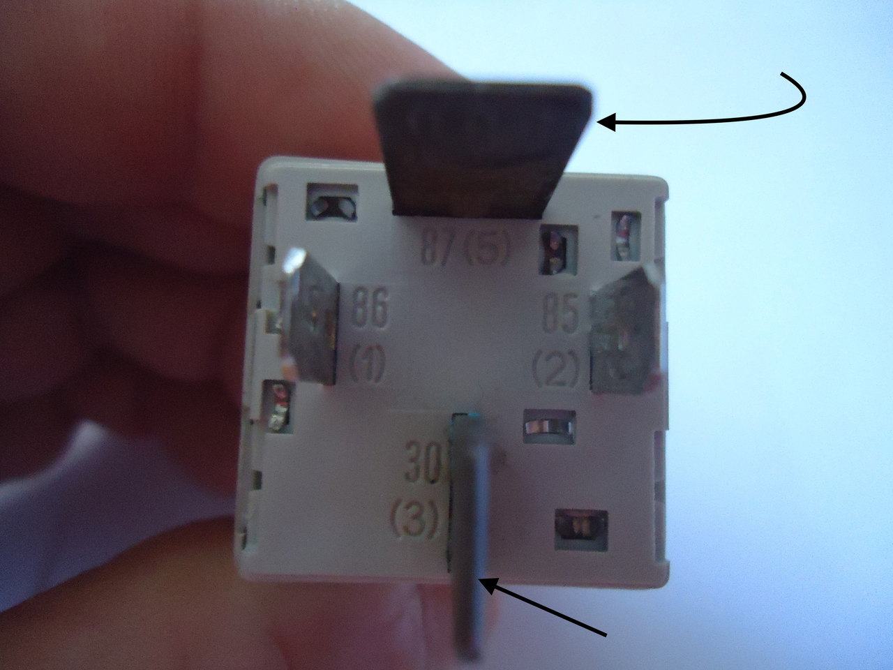Ya rien de plus simple pour ton relai Olivier en plus tes 2 relais sont identiques . Retire celui qui le plus à droite sur ta photo et regarde le schéma indiquer sur celui -ci , et compare le avec ton nouveau relai il y a de grande chance qu'il soit identique . Flèches : contacts de puissance ou appareils à alimenter bornes 87 & 30 ou 5 & 3 . Ici relai 614 (démarrage) Borne 85 ou 2 = A2 bobine Borne 86 ou 1= A1 bobine * Quand le bilame est collé la continuité est faite en 5 et 3 -
