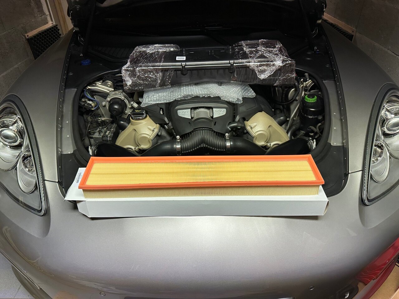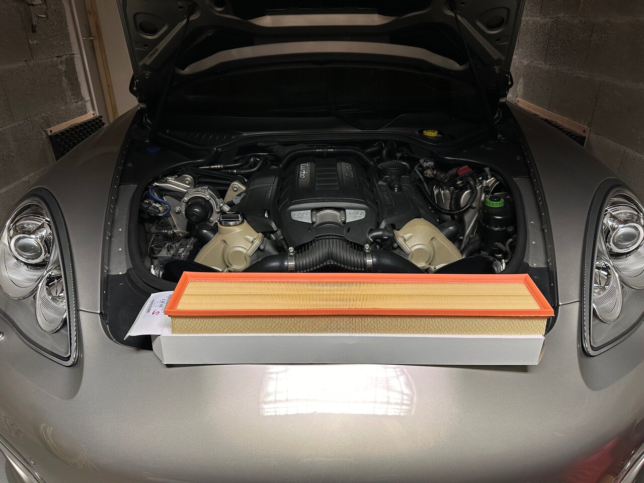 Remplacement du filtre à air de la Panamera à 167883 km . Pas de problème particulier , dépose du bouclier avant et déconnections des connecteurs de feux . j’ai profité que le bouclier était au sol pour checker et nettoyer les radiateurs et les intercoolers . j’ai aussi remplacé le boîtier à air, car celui-ci avait quelques vis de cassées par l’oxydation, j’y ai remis des vis inoxydable pour les futurs démontages .