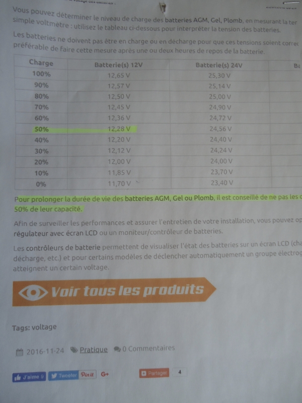 Voici un tableau avec les valeurs qui correspondent à la charge de ta batterie c'est valable pour toutes les voitures . Bon courage .