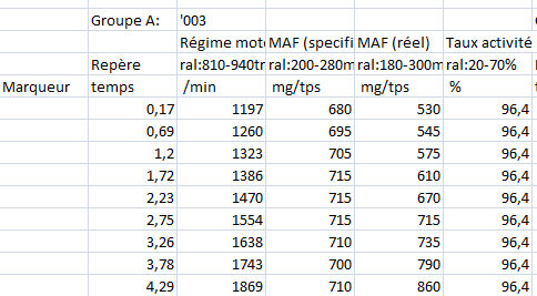 9. Salut. Sont bien faits des graphiques. Par contre je t'ai dit une bêtise. C'est un relevé du groupe 003 et non 010 qui donne la maf attendue et ma MAF mesurée. comme dans l'exemple ci dessous : C'est avec ce relevé qu'on en saura un peu plus pour le débitmètre. Tu peux aussi tenter de faire un relevé de plusieurs groupes de mesure en même temps le 003 et le 010 serait top. On aurait débitmètre et pression turbo.