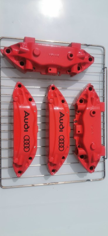 Bonjour à tous, Voilà le Kit gros Frein est arrivé... Étriers de VW Touareg soit disant, ce sont des 4 pistons, il y a avait des plaquettes Brembo de Ref : P85 110 sur l'un et sur l'autre des plaquettes VW Ref : 7L6698151J Donc que j'en déduis que c'est des VW Touareg, mais les étriers de Touareg sont en 4 pistons de 46 mm et en montage classique non en radiaux Donc mystère... Bon, il y a avait beaucoup du taff sur ses étriers vu leurs états je m'y attendais... Débute la restauration des étriers de freins Gros nettoyage et décapage de la peinture 3 Pistons grippés, vis rouillées et indémontable, heureusement doucement au chalumeau c'est venue de suite... un bon sablage obligé... Peinture Haute Température que j'ai eu au taff et Vernis Avion Cuisson longue durée 1 h 30 à 100 °c et laisser refroidir et repos 24 h ( là ça sera plus vu que j'attends le kit réparation étrier) Peinture Galva flash + vernis avion sur les vis et les adaptateurs Pour le montage: Adaptateurs pour des étriers Radiaux, que j'ai trouvé en Angleterre pour étriers Porsche 996 avec perçage à 12 mm pour fixer les étriers qui étaient d'origine en 12 x 150 J'ai été obligé de les re-tarauder en 14 x 150 pour le montage des 2 étriers VW Qui sont prévus pour des disques de 330 mm Max Normalement, je devrais pouvoir garder mes disques Brembo en 312 mm qui sont quasi neuf (des Brembo Xtra / ventilés et percés) Durites aviations (les 6) et plaquettes Brembo (Ref :P85 110) qui se monte que sur VW Touareg uniquement au dire le site Brembo J'attends encore les 2 kits de réparation étriers (joints et pistons en 44 mm et 40 mm en 30 mm de long) Mais les seuls kits réparation étriers qui correspondent à mes étriers sont ceux des Opel OPC et SAB 9.5 et qui ne sont pas non plus en montage radiaux, donc je ne sais d'où sortent ses étriers, qui étaient soit disant montés sur Golf 4 VR6 avec disque Merco en 330 mm, mais le gars a abandonné le projet... Enfin on verra bien, ça fera surement bien le taff Il reste un montage à blanc pour savoir si les jantes A8 Star passent avec le kit gros frein mais je pense que ça va être Chaud !!! Si non, je serais obligé de mettre des élargisseurs de voie + la révision et entretien de mon B6 : Peinture et vernis du coffre de toi en noir comme l'Audi Changement du cardant avant passager Changement des joints de caches culbuteurs ( Peut-être je vais peindre les caches culbuteurs en rouge également) Cylindres blocs d'échappement arrière Filtre Habitacle les 2 Câbles de frein à main à changer également, ça va être la galère je le sens Nettoyage des pistons des étriers Arrière Montage des durites aviation Montage du kit gros frein Purge complété et quelques bricoles encore... Voila les news les amis... Après décapage: Adaptateurs étriers Radiaux Porsche 996/986 pour disque en 330 mm: Perçage à 12 mm: Taraudage en 14 x 150 Peinture Rouge HT : Stickers Audi Cuisson au four : Kit réparation étriers Frenkit en 40/44 mm -