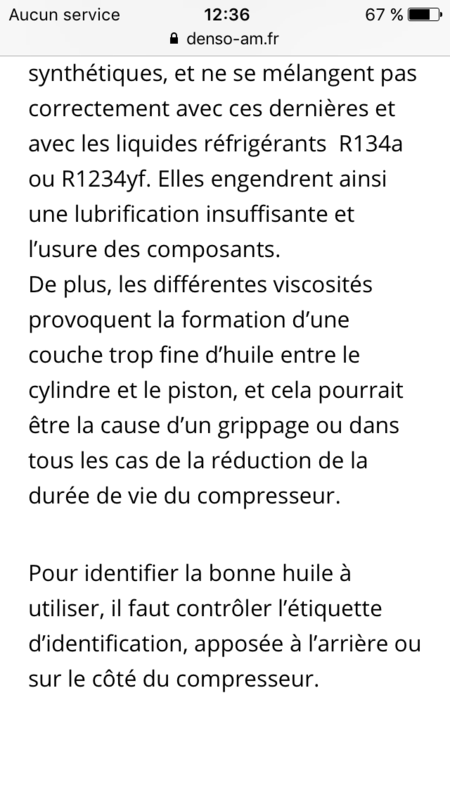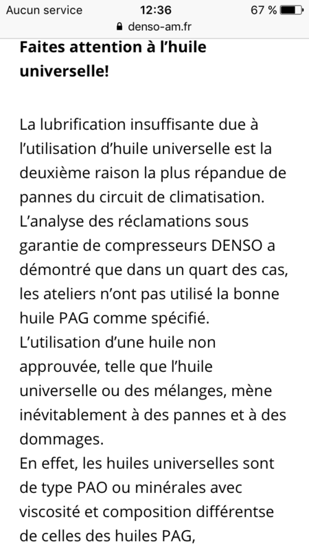 Je me permet de faire la suite de ce post qui m'a sauvé ma clim sur une a8 d3 symptôme : le ventilateur moteur ne démarre pas ou alors en 1e vitesse et chute de température de pas plus de 10° en sortie de bouche pendant 10sec puis plus de clim après vérification au vag com j'avais des pannes sur le capteur hp g65 et la vanne n280 mais rien d'autre pas de fuites et selon mon mécano local , je cite " le compresseur fonctionne". bref démerde toi avec ça .... donc après moultes recherches et achats de pièces, je change le filtre dans la durite h.p et la :pleins de limailles d'alu je fini par tombé sur ce post , je démonte le dit compresseur , l'ouvre , pour trouvé ça : piston et chambres mortes je précise qu'il a deux ans bref je remercie norodaube d'avoir mis une huile standard donc je me suis pris selon les préconisation denso une flasque de bonne pag 46 a 16€ évidement trop chère pour un forfait clim a 40€ et un compresseur d’occase a 80€ si cela peur aider d'autres dans le même cas bisous a tous -