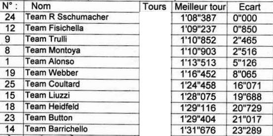 [attachmentid=17557] Le voilà... Donc, le principe est simple... qui a fait quoi ? L'image jointe vous donne les numéros de kart avec les temps... Les numéros des karts : 1 - 8 - 9 - 12 - 14 - 15 - 18 - 19 - 23 - 24 - 25 Voici le nom des participants (par ordre alphabétique, je ne vais pas vous les mettre dans l'ordre !!): 1 - Ania 2 - Baloo Fils 3 - Baloo Père 4 - coco 5 - Dino 6 - Docte56 7 - Korbend 8 - Laurie 9 - Sopher 10 - Sopherette 11 - Yoco 2ème partie : 5 karts ont fait 6 tours 4 en ont fait 7 et 2 karts 8 tours... Donnez-moi leur noms 3ème partie... Donnez-moi dans quel tour chaque participant a fait son chrono le plus rapide... Voilà c'est parti ! bonne chance... La gagnant (le plus rapide a avoir TOUTES les bonnes réponses gagne un voyage aux seychelles 3 semaines en hôtel *****) C'est royal hein ! Meuuuuhhhh non, je déconne, y'a rien a gagner ! c'est juste pour le fun !