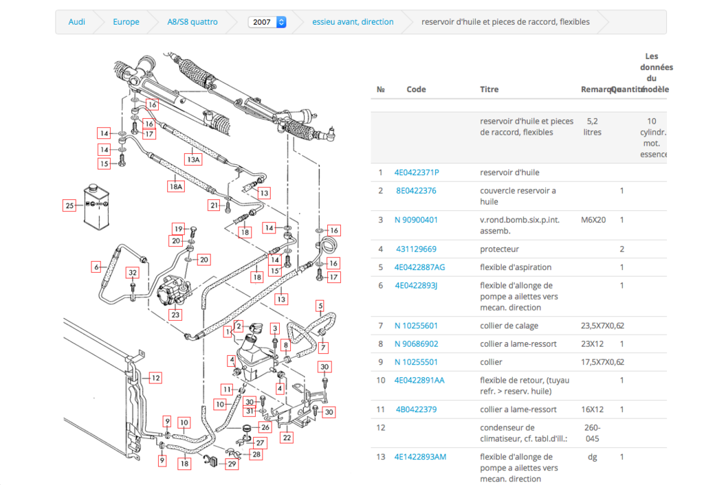 Surprise en voulant sortir la S8 du garage : plus de direction assistée !!! A l'étape 12 de mon tuto, les 2 durites sont en fait des durites de Direction Assistée (et non de clim, me demandez pas pourquoi chez Audi ils ont fait passer du DA dans le condenseur de clim ?) et donc attention à penser à ajouter du liquide DA (le bocal est sous le filtre à air côté conducteur, c'est chiant il faut le démonter du coup...) lors de la repose. Ci dessous le schéma ETKA qui confirme :