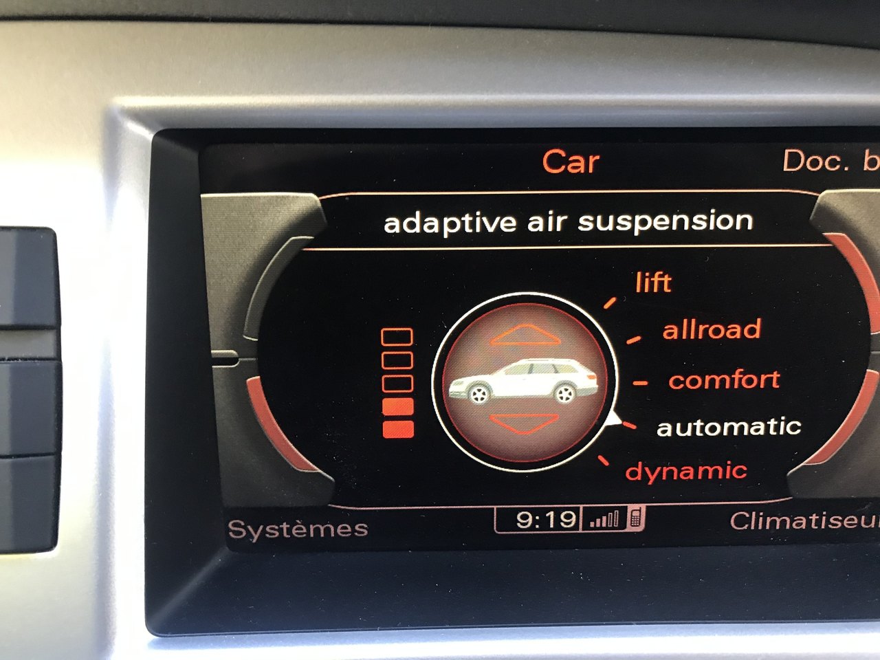 Bonjour bonsoir à toutes et tous, à mon tour pour les histoires de suspension 😱 le correcteur d’assiettes qui merde, passage au vcds😉. Quand j’essaye de la mettre en position allroad, elle veut pas monter, ça ce grise sur l’écran du mmi et les voyants de suspensions s’affiche sur le tableau de bord, ce sont que les suspensions avant qui redescendent et pas l’arrière, elle monte juste en position confort. A votre avis je peux rentrer comme ça 🤔vendredi (289 bornes).