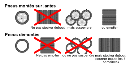 Si les pneus ne sont pas montés sur jantes il faut les stocker sur la bande de roulement (la tranche comme tu dis) les uns à coté des autres et il faut les faire tourner au moins d'un 1/4 de tour tous les 15 jours / 3 semaines pour éviter d'éventuelles déformations. Ils doivent poser pas terre ou sur une rampe comme dans les garages mais pas par le biais d'un crochet. Si les pneus sont montés sur jantes, il faut les empiler à plat les uns sur les autres ou les suspendre pour leur stockage. Sinon à stocker à l'abri de la lumière, idéalement dans le noir, dans une une cave pas trop humide ni trop sèche, dans ces conditions ils peuvent se garder quelques années sans problèmes. L'ennemi c'est la lumière (les U.V) et accessoirement la chaleur qui dégradent la gomme du pneumatique. PS/ @Buddy Guy j'aime assez l'image de la table basse de salon, super design et en 17" c'est pas trop encombrant Par contre, c'est zéro coté stockage, les pneus posés à plat empilés manque plus que les pieds sur la table et les cigarettes écrasés contre les flancs, le tout à coté du radiateur... Au secours !!! -