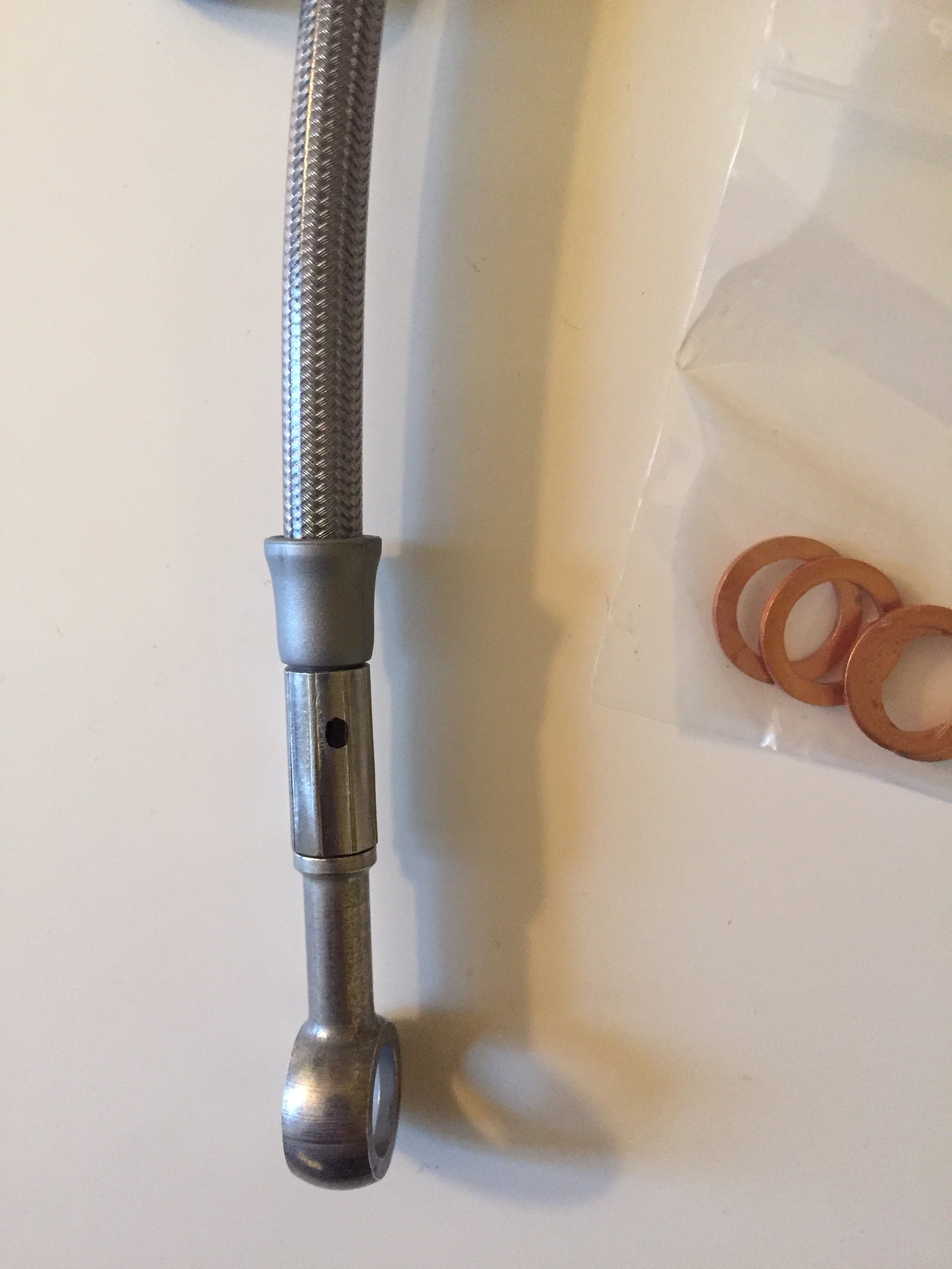 Les flexibles de freins sont arrivés, c’est du costaud. Une bonne purge, sans oublier le récipient qui va bien -