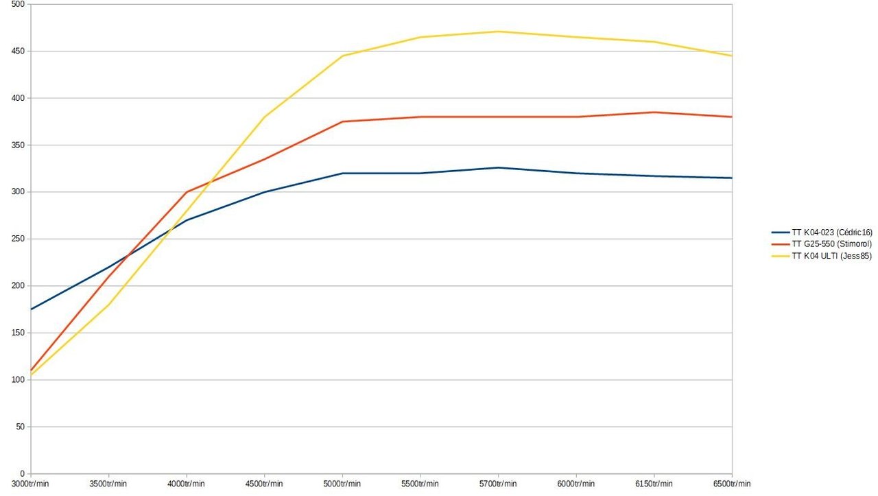 Voici des courbes de puissance comparatives avec Cédric et son k04-023, et Stimorol avec son G25-550 (qui peut certainement prendre 50ch avec changement de pompe + intercooler). ça démarre de 3000tr, et on peut voir que le k04 ulti est un peu en retard. -