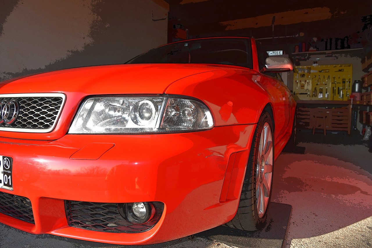 Très jolie, bravo. J'adore ces voitures qui assument leur physique bodybuildé et qui se démarquent ainsi nettement du modèle de base (Golf IV R32, R5 Turbo, Safrane Biturbo, Lotus Omega, 205 T16, Clio Williams, R21 Turbo, Escort et Sierra Cosworth, M3 E30, Alfa 147 et 156 GTA, Lancia Delta Integrale, Golf Rallye G60, 190 2.3 16s, Z3 M coupé, BX 4TC, Civic Type R... et RS4 B5 bien sûr !!!). -