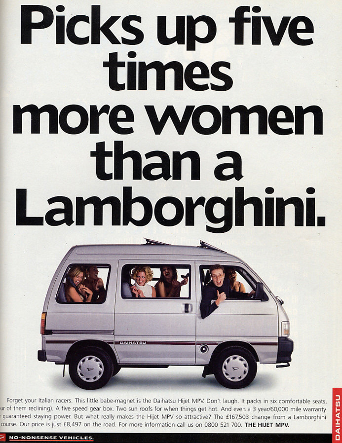 Quand on ose se comparer à Lamborghini, mais qu'on a un truc en plus : "L'idée de base derrière le break Volvo Turbo." "Ramasse cinq fois plus de femmes qu'une Lamborghini."