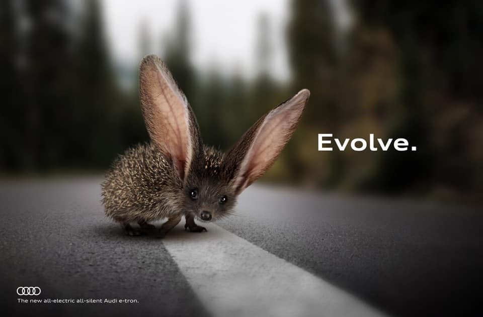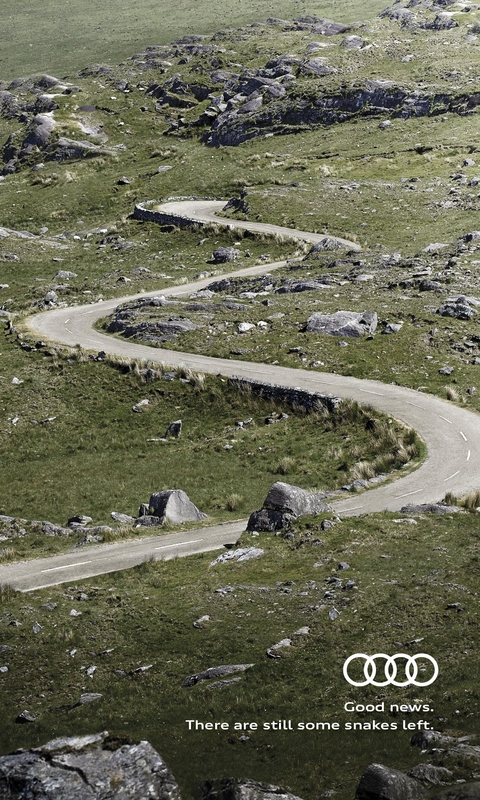 Peu de retours sur l'accroche de cette route de montagne qui ondule dans mon précédent post. OK pour le bonheur de la subsistance de ce tracé qui serpente et ces deux rochers en forme de crochets venimeux, mais pourquoi "left" ??? Du très basique (extrapolation simpliste du logo)... ... Au bien plus subtil (l'e-tron responsable à terme de l'EVOLUTION des espèces).