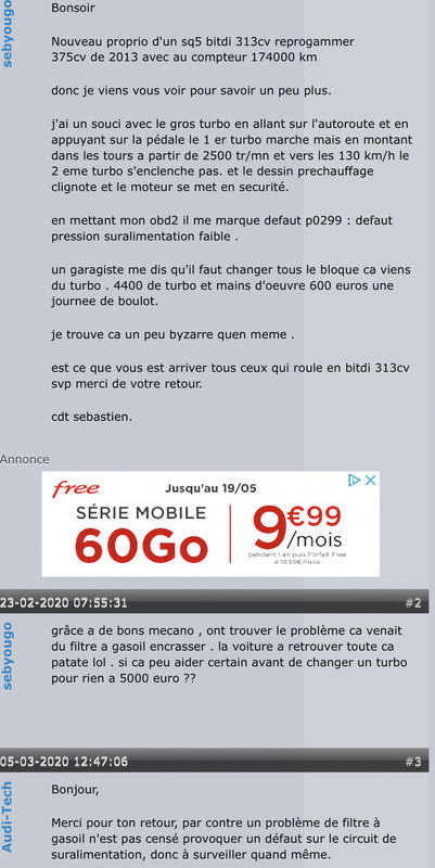 Bonjour , même problème P0299 sur mon Q5 ou j ai changé le turbo et la wasgate Electronique ainsi que capteur de pression sauf débitmètre et n75 mais j y crois pas avez vous résolu le problème ? merci par avance -