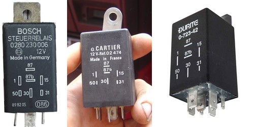 Voici le cablage typique des relais tachymétrique cités ci-dessus : 30 = + batterie permanent 31 = – permanent (masse) 1 = signal allumage 50 = 12V solénoide démarreur 15 = 12V contact 87 = accessoire à alimenter (pompe carburant) 87b= accessoire à alimenter (systeme injection ou autre) Le Cartier 02374 ne dispose pas de la borne 50 … puisqu’il fonctionne sous le mode temporisation, il n’est pas nécessaire de le relier au 12V Solénoide démarreur ! Coté équivalent, cherchez le Hueco 13-2020. -