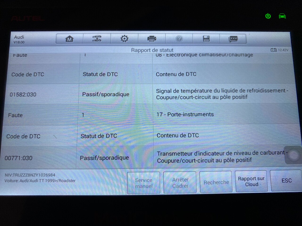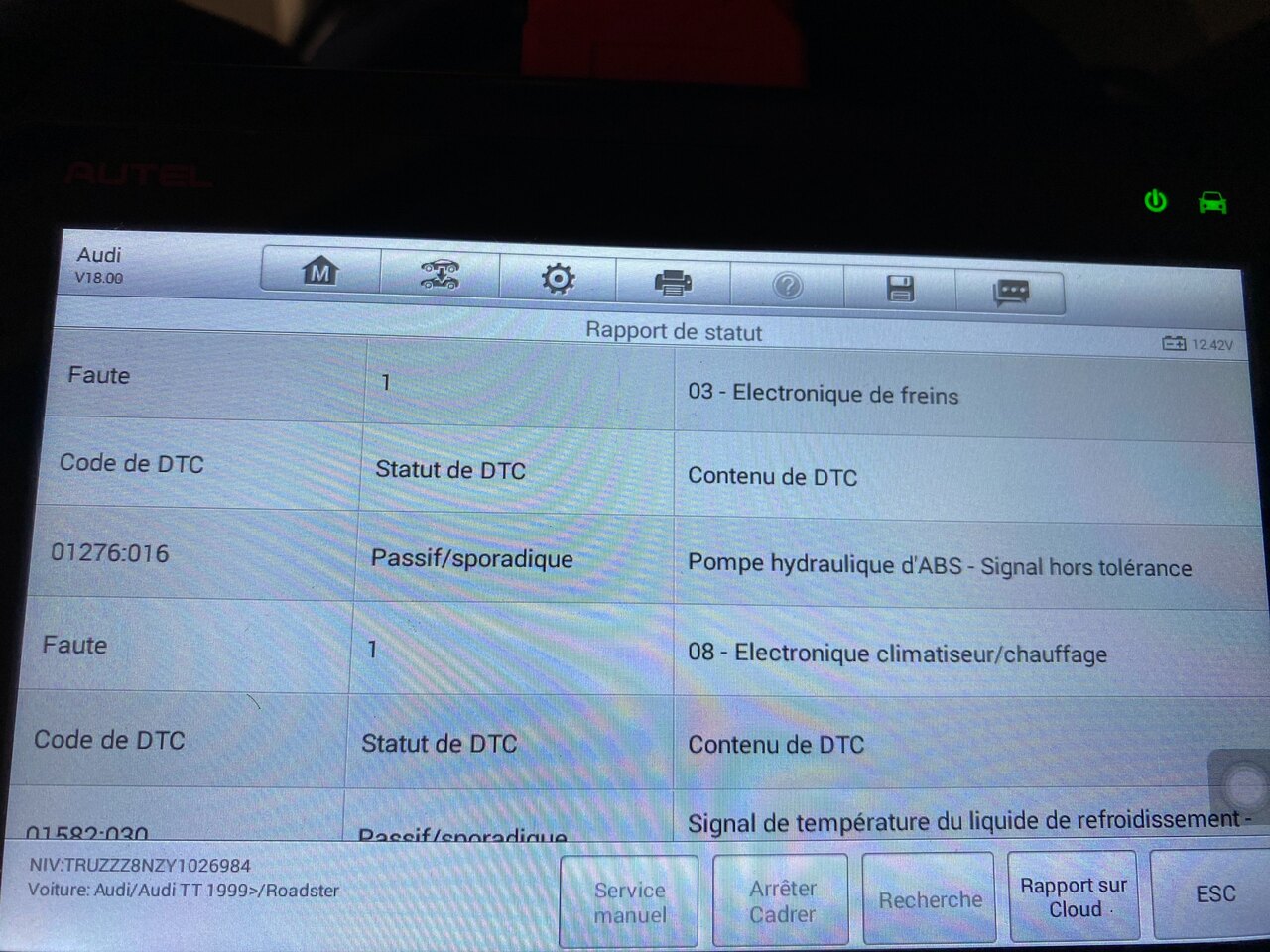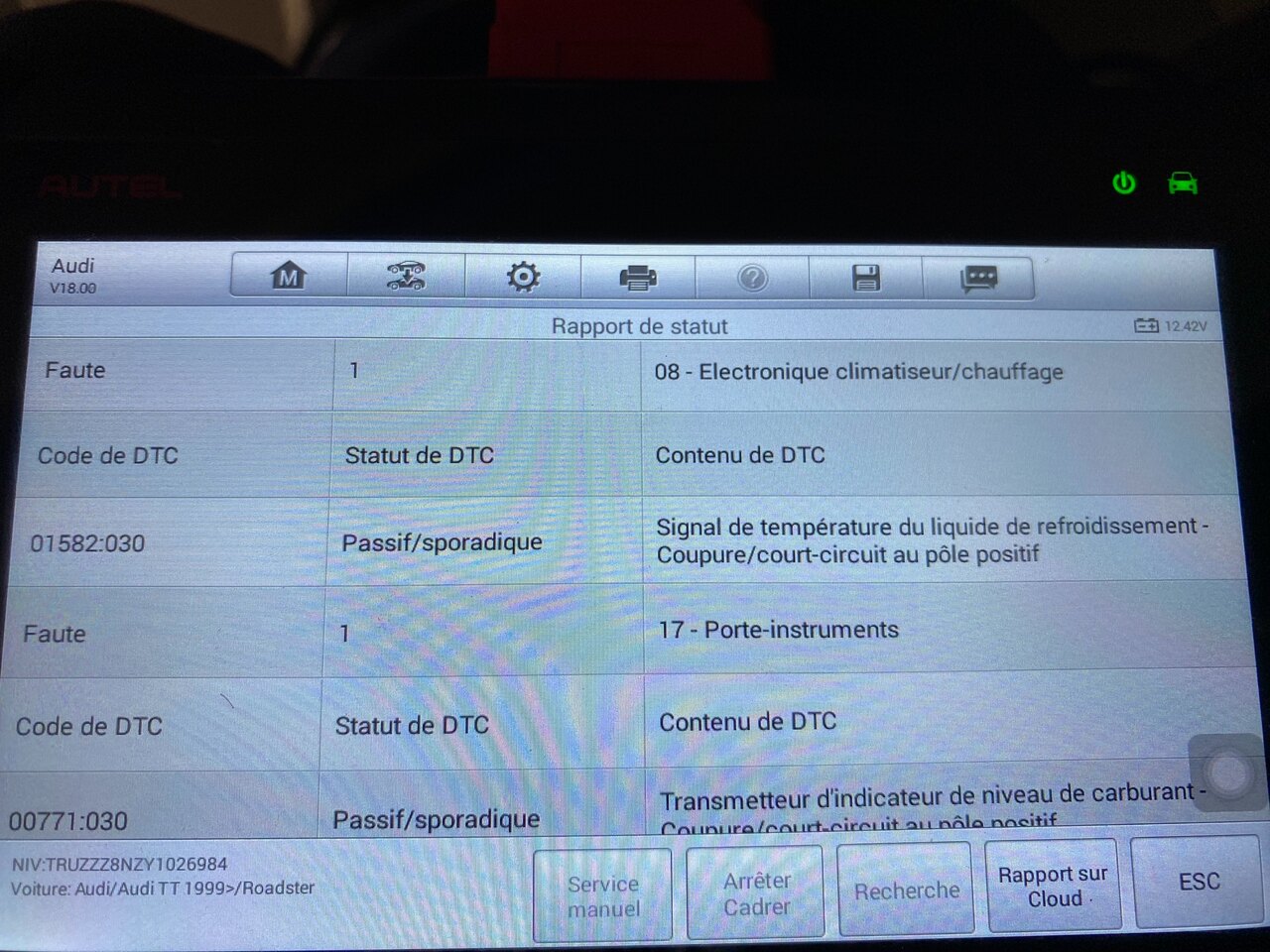 Bonsoir. Donc voila la suite de mes problèmes. Je rentre d'une petite ballade. Je m'aperçoit que je perds du liquide de refroidissement. J'arrive à trouver, c'est la bride qui est fendue. Je laisse le TT au garage le temps de commander la pièce, filtre à air démonté. Quelques temps plus tard, je dois bouger le TT. je remonte le filtre à air, et là, elle ne démarre pas. Je n'entends pas la pompe à essence se mettre en route et l'essence n'arrive pas au moteur. Après recherches, il s'avère que la pompe à essence n'est pas alimenté en 12 volts. Je sors le fusible n° 28 (pompe à carburant), et avec le contact mis, je n'ai aucune arrivée de jus sur les 2 plots. J'entends également un sifflement en continue qui vient du moteur. J'enlève donc les fusibles 1 par 1 pour essayer de savoir d'où ça vient. Le bruit se coupe au fusible 29, J220 Calculateur du système motronic. Et en plus de cela, lorsque je veux pas au VAGCOM, impossible, il trouve rien. Je vais donc dans le test port et là, état K2: CC à la masse. D'après Ross Tech, cela pourrait venir d'une masse sur l'autoradio, qui pourtant est d'origine. N'ayant pas les clés, je n'ai pas pu le démonter. Voila ou j'en suis. Quelqu'un pourrait me dire si tout ça à une suite logique? Que tester maintenant? Par avance merci Serge