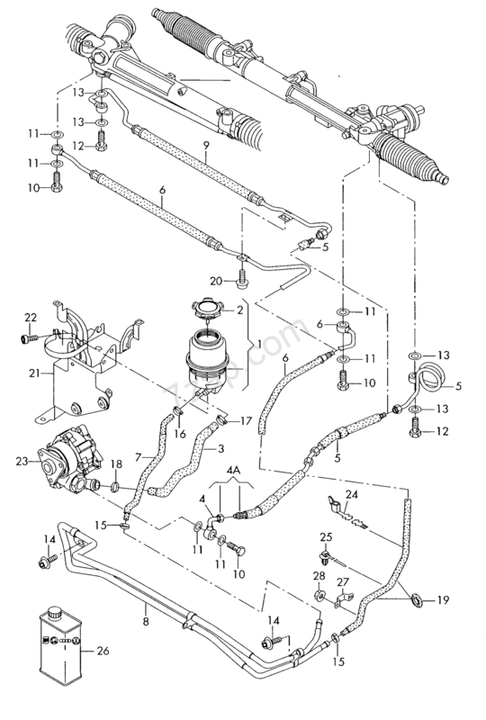 Je pense pas qu'il y ait un tuto.J'ai démonté la mienne cette semaine sur mon V6 TDI(joint spi fuyard).La procédure AUDI préconisait le démontage de la face avant pour y avoir accès.Travaillant juste dans 1 box je n'ai pas la place,donc j'ai tout fait par le haut et ça se fait bien.En gros,tu dois enlever la courroie juste pour cette poulie pour ne pas faire tout le circuit,enlever 3 vis xzn qui maintient la poulie et là tu aurras accès à 2 vis devant (clé de 13) et une derrière(ce sont les 3 vis de fixation sur le support pompe).Bien sur penser à enlever les durites aller/retour.Tu mets les durites vers le haut et tu n'aurras pas d'huile qui coule.Quand tu mets la nouvelle pompe tu mets de l'huile dedans et tu la fais tourner dans le sens des aiguilles d'une montre afin qu'elle soit lubrifiée dès qu'elle tourne.En fin de compte quand tu localises ta pompe tu vois comment tupeux procéder pour y avoir accès.Ex j'ai du démonter le collecteur d'admission.C'est juste du démontage et remontage.Voici ton circuit qui est quasi identique au mien -