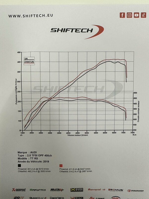 Je m’y suis fait, c’est globalement en ralenti et réservoir plein. Un coup de gaz et c’est fini 😁 Surtout qu’elle marche de folie cette TT RS ! En copie la courbe avant/après admission eVenturi. Plus de 400ch, c’est habituellement une valeur pré FL (sans filtre), les phases 2 tournent en moyenne à 370-380 ch sur ce banc Shiftech. -