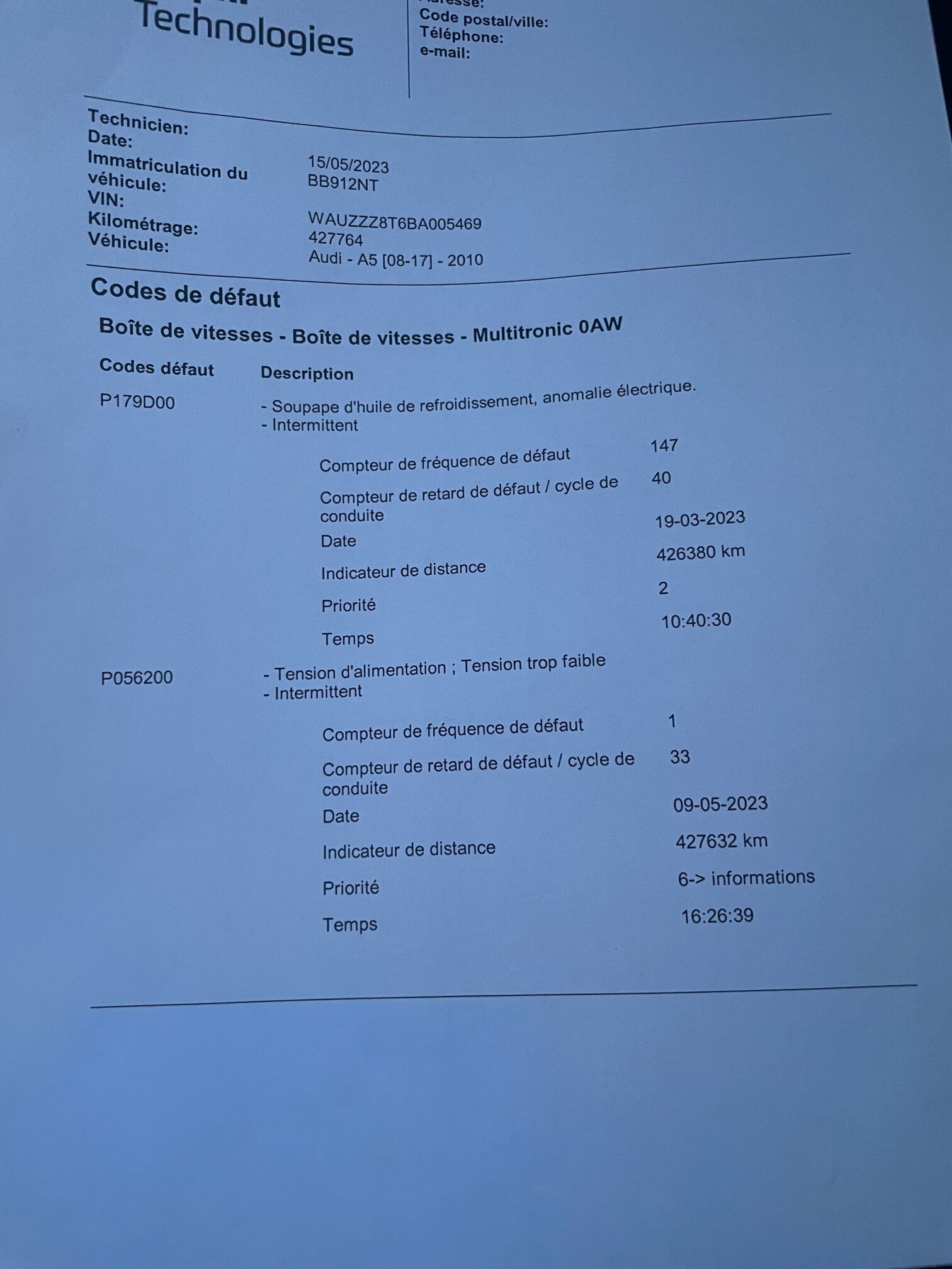3. Bonjour a tous, Depuis quelque jours, j ai une erreur sur l ODB « dysfonctionnements boite de vitesse, vous pouvez roulez ». J’ai déposé ma voiture au garage et voici le rapport. Il m annonce que la boite de vitesse est HS mais j aurais bien voulu avoir un autre avis. Merci d avance pour votre retour. Jean louis