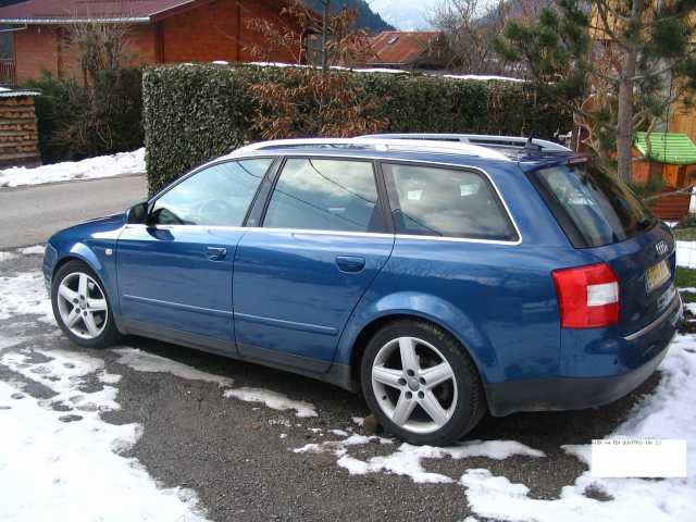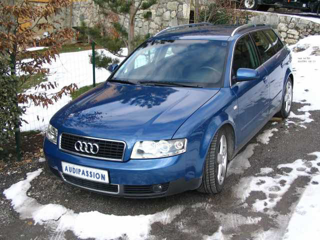 - membre : Taz Devil - année de fabrication : 2002 - voiture achetée neuve / d'occasion : occasion - modèle : A4 B6 - moteur (cylindrée et puissance): 2.5 V6 TDI 180 ch - préparation moteur (nom du préparateur / puissance obtenue) : - berline / avant / cabrio,road : break - version (ambiente, ambition, pack plus,...) : pack sport - boîte manuelle / automatique / DSG : manuelle - traction / quattro : Quattro - couleur extérieure : Bleu Ming - couleur intérieure : noir / gris - finition intérieure (tissu, cuir, cuir/alcantara,...): tissu - jantes (taille / dénomination): Audi toile 5 branches / 17’ - pneus (fabricant / modèle): Michelin / Pilot Sport - châssis modifié : - freins modifiés : - options / divers : peinture métal, radar de recul, prépa tel, xenons, chassis + volant + fauteuils sports[/b] -