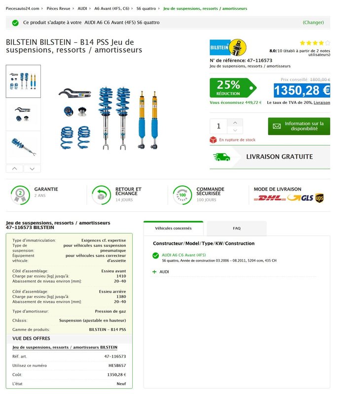 14. Salut, Je cherche à rabaisser ma s6 avant de 2006 d'environ 30 à 40mm. Quelqu'un pourrait m'indiquer un kit combinés filetés compatible s'il vous plait ? Le problème est que je trouve un peu de tout comme kits je n'arrive pas à être certain que le kit est compatible avec ma voiture. Je n'aimerai pas avoir commandé le mauvais kit non compatible avec ma voiture et devoir le renvoyer... J'ai vu le kit AP GF10-055 par exemple mais impossible de valider la compatibilité (certains cites disent que oui et d'autres disent que non....) alors j'ai envoyé un email directement à AP mai sj'attends la réponse. Quelqu'un pourrait m'aider svp ? ou alors si vous pouvez m'indiquer la ref des ressorts seuls compatibles avec ma voiture ? (rabaissement -30mm) (j'ai trouvé le kit H&R 25/15mm mais je trouve que cela ne la rabaisse pas assez) : https://www.tunershop.fr/ressorts-courts-h-r-29200-4-pour-audi-a6-avant-sw-incl-quattro-s6-avant-sw-v10-5-2l-quattro-s6-s7.html Merci