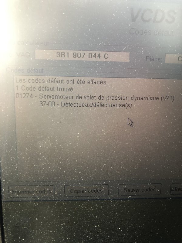 je poste là pour une golf IV ( similaire à A3 ) modèle des années 2002 en 1.9 tdi moteur ASZ je me permet de poster là car, je possède une A4 en B6 130. ~~~~~~~~~~~~~~~~~~~~~~ je viens d'acheter cette golf 4 j'arrivais pas à trouver une A3 j'ai pas de chance le garage avant vient de me faire la distri / et les 2 triangles et aussi (problème climatronic ) un compresseur neuf et un condenseur J' AI DU FROID SURTOUT LE MATIN , mais l'après midi quand il fait 36 ° dehors ?? elle fait clac au compresseur et fait du froid ( en automatique sur 21° ( ex) et le fait que s'arrête , ou marche 15 secondes et se débraye j'ai passé le VCDS et il me sort ="" 1274 "" - SERVOMOTEUR VOLET PRESSION DYNAMIQUE - ( v 71) 37.00 défectueux ~~~~~~~~~~~~~~~~~~~~~~~~~~~~~~~~~~~~~~~~~~~~~~~~~~~~~~~~~~~~~~~~~~ mes questions = * ) j'ai sorti la boite à gants coté passager et je vois rien pas de volets etc.. *) est -il possible que si des volets ne fonctionnent pas bien , ce soit ça qui fasse que mon compresseur se mette en route pour aussi tôt se couper l'après midi ?? ça joue à ce point sur la marche de la climatronic ??? le matin par 23 ° , il marche et tient ! j'arrive pas à voir plus en démontant la boite à gant , il y a un gros bloc noir avec des fiches et je suis perdu; certains parlent de petit levier etc..ou de reset et apprentissage de la clim mais je sais pas faire merci si vous savez me répondre ! c'est une similaire à a3 ) jean-jacques du sud