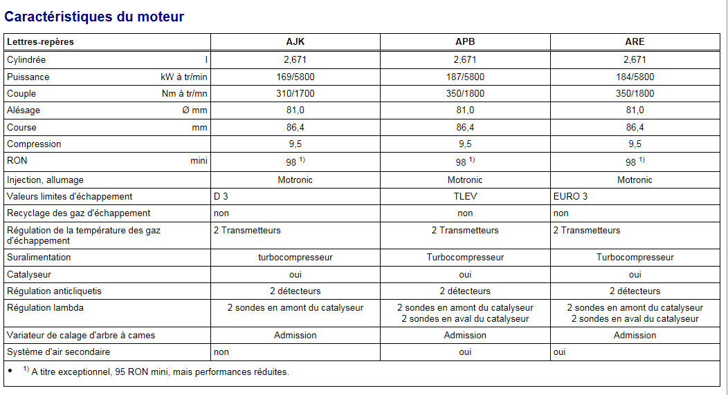 5. Une petite question, qui n'est pas directement liée à mon problème. Il me semblait que le 2.7t prenait du SP95 (c'est même ce qui est marqué dans ma trappe d'essence il me semble) mais je viens de voir que dans ELSAwin c'est du SP98 qui est préconisé avec du SP95 autorisé à titre exceptionnel avec une perte de puissance... Pour le moment c'est du SP95 dans son réservoir du coup. Il boit quoi votre 2.7t?