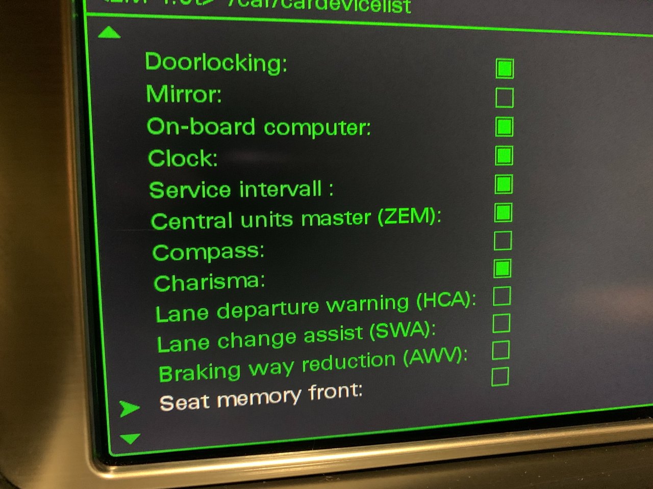 Bonjour @couettecouette, D'abord merci pour ton tuto! J'ai les sièges chauffant en première monte sur mon A5 facelift, mais je suis en ce moment sur un autre souci, je rattrape des codages un peu foireux petit à petit de l'ancien proprio. Et je voulais connaitre pourquoi tu coches "Seat heating" dans cardevicelist2 que je n'ai pas par défaut sur première monte? D'origine il ne l'est pas dans la mienne. De plus il me semble que pour faire apparaitre dans mon cas particulier les sièges à mémoire dans le MMI de manière configurable, il faut être en CAN Konfort, et tourner la molette pour choisir un numéro sur la barre verte dans "carmenuopération" ce qui affiche ou non dans le MMI les options des sièges. Merci de ta réponse. -