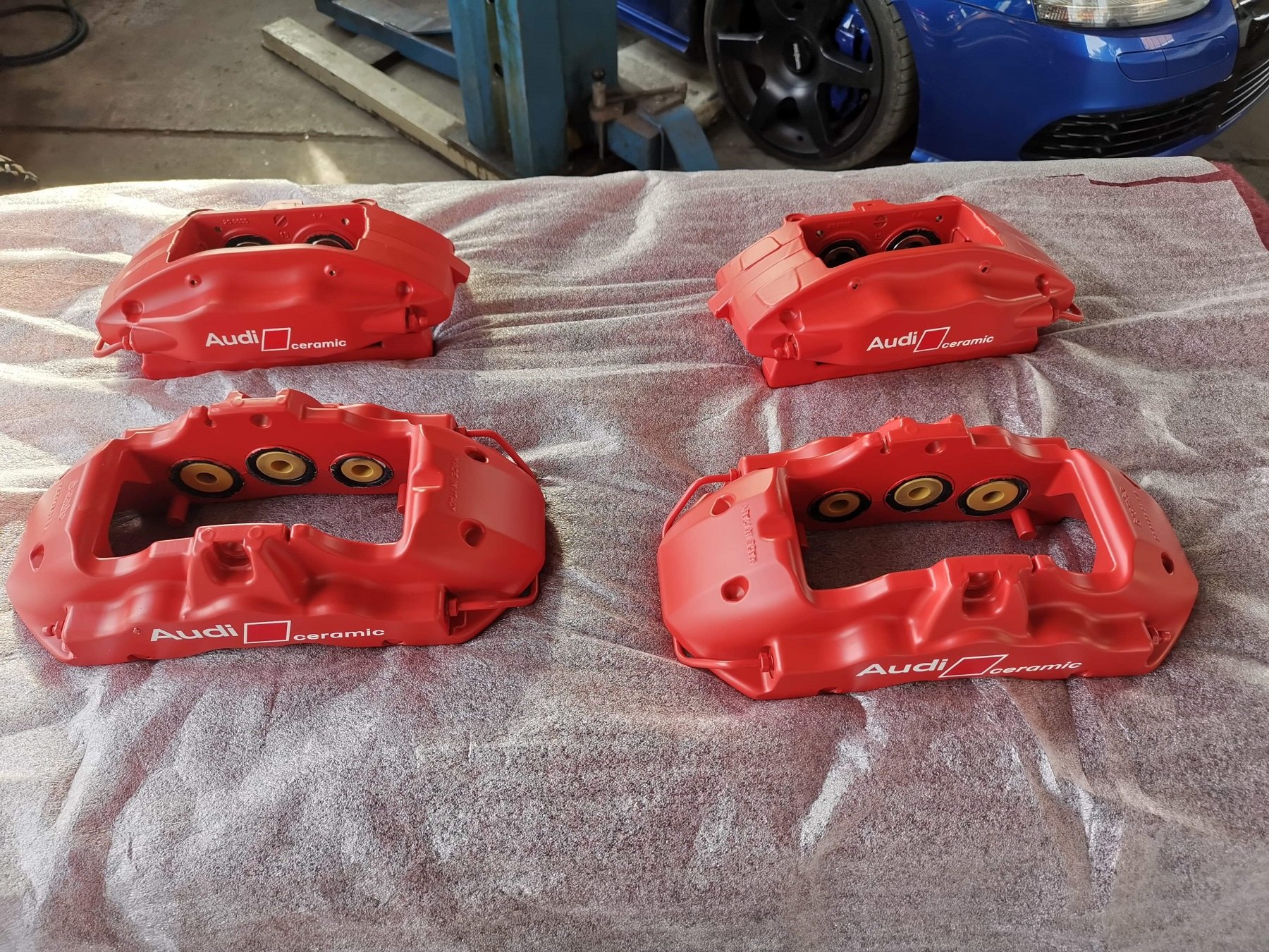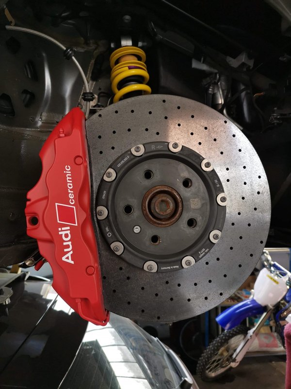 Moi , je la trouves assez souple ,en confort , voir même trop bateau . Mais j'aimes ce qui est raide , comme ma femme d'ailleurs . Après , pour avoir eu des ressort H&R et des KW Clubsport sur mon RS3 , je sais que mon RS3 était beaucoup moins dur avec les KW , qu'avec les ressorts . Par contre , avec les clubsport , on peux dire que ça trépidait un peu , on sentait le grains de la route . Mais l’efficacité était tel , que ça passait crème . Là , je verrais . Les ressorts , les vrais , sont ceux qui sont plus épais , les autres , très fin , ceux de précontrainte , sont juste là , pour éviter que les ressorts se trimbale sur l'axe , en cas de levée , ou de rebond . Et les ressorts principaux sont tarés beaucoup plus dur que les origines , il y a même possibilité pour des amateurs aguerri , de commander des ressorts avec une force spéciale . Quand tu est au réglages de caisse au plus haut , ou la voiture en appui sur ces roues , les petits ressorts sont comprimés , et les lamelles se touchent . Les étriers de freins , non pas jaune , et je teste une teinte que je n'ai encore jamais vu sur des étriers Les jantes seront black mat . -