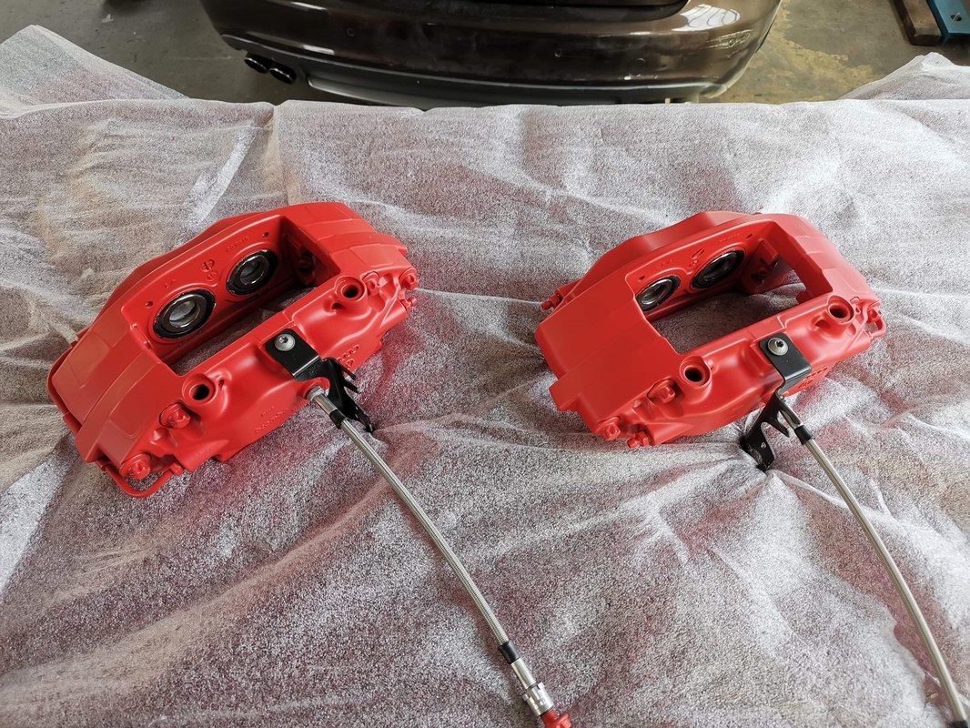 Voilà , vacances fini , un peu de news , des tofs surtout . Sinon oui les vacances , ça fait du bien Peinture des jantes Noir Frozen metal mat , etriers rouge Lambo Bia , mais recouvert en vernis mat , stickers sous le vernis , pose des durites et changement de liquide , centre de roue accordé aux étriers fait au cure dent . Peinture du tour chromé de la calandre en noir brillant et du nid d'abeille en noir mat Pose des lames , réglages hauteur de caisse à - 20 Av/Ar . -