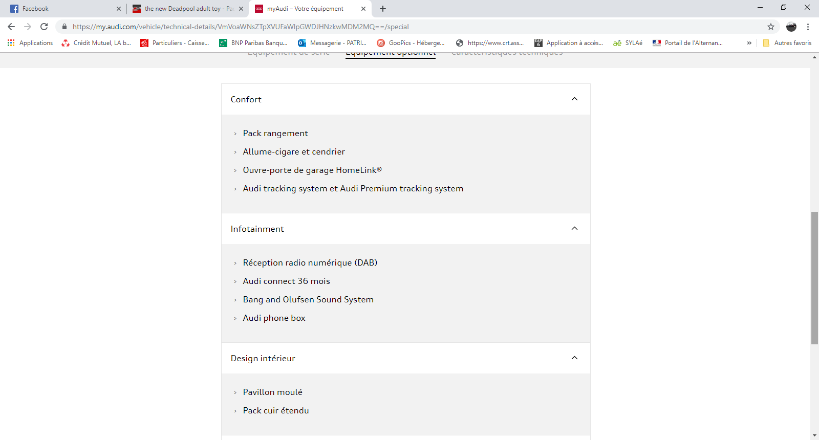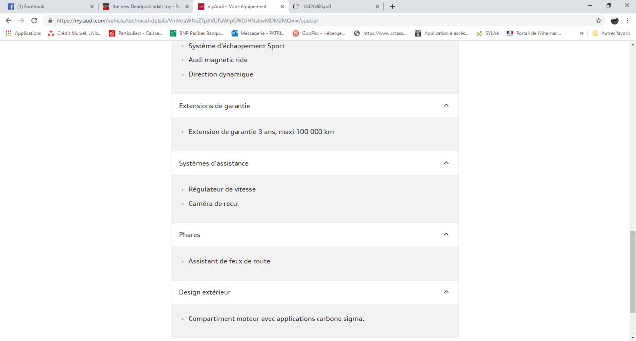 Un trésor de pirate caché tu veux dire . Sinon , donc comme j'ai demandé à ma CC de confirmer mon R8 , maintenant je sais ce que j'ai en option France . Donc nous avons une auto en octobre 2015 à 199 000 euros 3990 euros l'extension de garantie 3 ans /100000 2230 euros l'échappement sport 730 euros parking system plus avec caméra 2110 euros magnetic ride 1640 euros direction dynamique 60 Allume cigare et cendrier (que je n'ai plus) 3290 euros le ciel alcantara avec surpiqûre en losange 320 euros le home link 3610 euros pack cuir étendu ( tout l'intérieur est en cuir , hormis le ciel en alcantara ) 215 euros l'assistant feux de route (que j'ai désactivé car je déteste ) 590 euros radio DAB , inutile en france , je crois 330 euros le pack rangement ( ça me fait un peu sourire , je peux y mettre une trousse de crayons ) Total config france , car en allemagne , d'autre choses se rajoutent en option . 218115 euros -