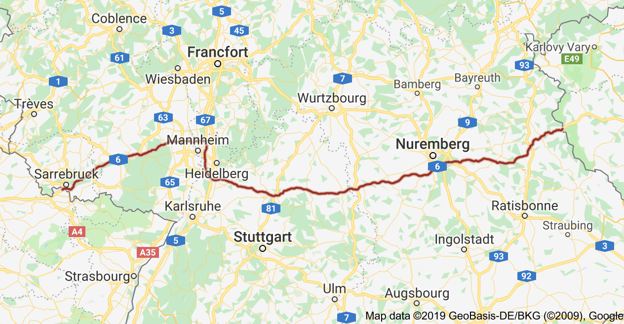 Petite photo , là effectivement j'ai eu le temps de prendre une belle photo Quand j'ai quitté Regensburg , la 1ère autoroute que j'ai pris , si j'ai bon souvenir est la 63 , de ratisbone jusqu'à nuremberg , puis ensuite la 6 jusqu'à la frontière , comme sur cette image C'est plus le fait d'une de mes journées type " La faute à pas de chance " que mon bref séjour a été chaotique . Une chose est sûr , celui qui parles anglais n'aura aucun souci la-bas , c'est limite une langue maternelle pour la majorité d'entre eux . Et l'acceuil et la joie de vivre l'est d'autant plus , surement plus que nous français vis à vis des touristes . Au point que , nous avons décider avec mon épouse qu'il fallait vraiment que l'on s'y mette , car c'est plus qu'utile . Et ça nous servirait pour nos vieux jours quand on va virevolter un peu partout dans les 4 coins du monde , c'est en tout cas , ce que je me souhaite si j'arrives jusqu'à cet age là La suite du périple est presque terminé , nous roulons enfin tranquille , quelques petits joueurs en BM , comme toujours , je traces quand même pas mal , mais toujours pas compris quelle était la limitation quand un Rond blanc , marqué 120 ou 100 ou 80 grisé et barré de 3 barre grisé , comparé à un rond blanc sans inscription , mon GPS ne m'indique pas de vitesse , bizarre , car j'étais persuadé que au démarrage de mon périple en pleine ville et dans le peu de départemental , il m'indiquait la vitesse limite . Bref , mon coyote lui ne m'a pas aidé , il m'indiquait n'importe quoi , sans limite dans des portions limité à 100 et limite de vitesse à 150 ailleurs . donc je ne m'y suis pas fié . J'ai suivi e flots de circulation , et quand je voyais une majorité rouler à des vitesses assez élevé , ben je fonçais un peu plus . Mon GPS s'est soudainement mis à me dire faites demi-tour , je regarde le virtual cockpit , je comprends pas , il me fait voir que je suis en pleine ville , et il me l'a fait sur une bonne centaine de kms , je ne faisais que de la ville d'après le GPS ou du off road , je l'éteins , je rallumes , rien à faire , toujours pareil. Pas grave , j'ai souvenir qu'il me disait de continuer sur cette autoroute pendant au moins 140/160 kms . Sauf que tellement omnibulé par çà , que je n'ai pas regardé la signalisation sur les bas coté pour les aires de repos avec station service à combien serait les prochaines ,etc.. Voilà que je vois qu'il ne me reste plus que 80 kms d'autonomie , ce qui affole madame , je scrute les bas coté , mon GPS ne fonctionne toujours pas , je fais encore 20/30 kms a un bon rythme , madame commences à s'enervé parce que je ne roules pas à l'éco , pourquoi ? ben va bien y avoir une station !! , je ne vois rien et pas de panneau , elle mets ggole map's en route et celui nous fait sortir de l'autoroute , peu avant sarrebruck , et lui aussi a du merder , ou alors nous étions bien fatigué , on s'est retrouvé dans une zone industrielle arrété quand nos deux GPS , nous ont dit que l'on était arrivé à destination Euh , on deviens fou ? y a pas de station ,il me reste plus que 45kms d'autonomie , la dame qui m'accompagne que je ne reconnais plus ,est dans tout ses états , car pour arriver déjà là , on a tourner en rond , j'en suis sûr . Je coupes le contact de l'auto , pareil pour le tel et c'est reparti , le GPS a l'air de fonctionner , mais comme j'ai peur qu'il merde , on laisse celui du tel aussi , forcément il ne veulent pas se mettre d'accord sur l'itinéraire , et dans une région un peu vallonée et avec des montées et descente partout , ç'est moyen , mais on y arrive quand même , je en pourrais vous dire où c'était , mais c'était une station ARAL , ça j'en suis sûr . De là , on repars sans manger , car que de la gaufrette et biscuit , et je voudrais quand même manger un vrai repas . Le GPS me ramène exactement à la sortie prise et deviner quoi , hein , ben 10 bornes après la sortie , bingo station service , bon je le consoles , j'ai du payer l'essence moins cher ,sur 63/64 litres , ça doit être pas mal On trace , et première station française , on s'est arrété de nouveau , mais sans faire le plein pour manger et se détendre , une bonne demi-heure , où j'ai fait cette tof . Tout ceci ne m’empêchera pas d'y retourné , acheter de nouveau , car malgré que ce week-end , le sort avait décidé de m'emmerder , c'était quand même magique . Et l'économie globale CG comprise entre 20 et 30 Ke par rapport au prix affiché france , y a pas photo On s'est quand même dit que l'on allait retourner la-bas d'ici peu , pas regensburg , on y a pas d'intérêt , mais on voulait profiter de ce voyage pour découvrir un peu , et du coup la poisse a fait que l'on a subit au lieu de profiter , mais Zuniyte m'a dit qu'il fallait que l'on s'organise un week-end , voir des coins sympa , profiter de l'autobahn , y a plus qu'a . -