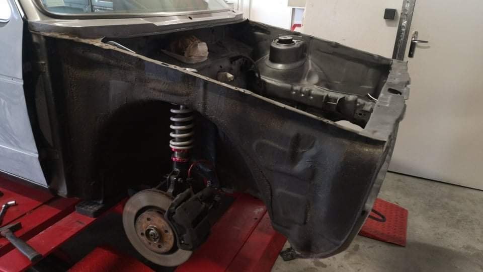 Récaro Sporter CS Commandé . KW V3 Commandé . Toute la boulonnerie , joints de carrosserie et circuit de freinage , au complet commandé, une partie est déjà arrivé. Au démontage, on s'aperçois que les fusées, disques et roulement AR qui d'apparence avait l'air bien, sont HS. , donc j'ai recommandé tout l'arrière en neuf, rainuré percé, et du coup par la même occas , j'ai commandé les deux disques AV dans la même config avec les plaquettes en EBC rouge. D'autres surprises sont apparu, en fait elle n'avait pas subi de restauration, mais simplement un entretien pour pas qu'elle pourrisse plus. Tout le lissage du compartiment moteur est à refaire, car il a été fait à la mode Kéké tuning , à la fibre. Une partie est partie au sablage, celle les plus rouillé/sale. L'autre partie sera poncé repeint. Certaines pièces sont déjà revenu du sablage, et d'autres sont déjà peintes. Et , j'ai reçu mes plaques noires, quel bonheur ce noir.